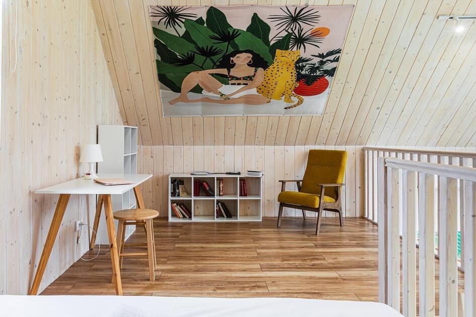 «Барн дальний» представляет собой уютный дом с панорамными окнами, идеально подходящий для тех, кто стремится к уединению и спокойствию. Яркие акценты, такие как стильный синий диван и вдохновляющая картина с тигром и пальмой, создают особую атмосферу, в которой легко расслабиться. Удобные спальные места обеспечивают качественный отдых, позволяя насладиться полноценным сном.