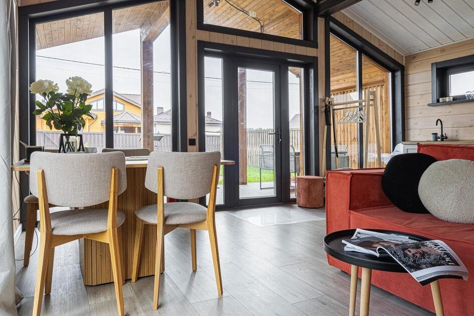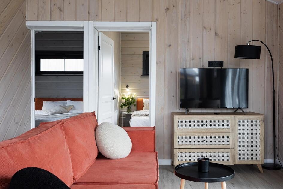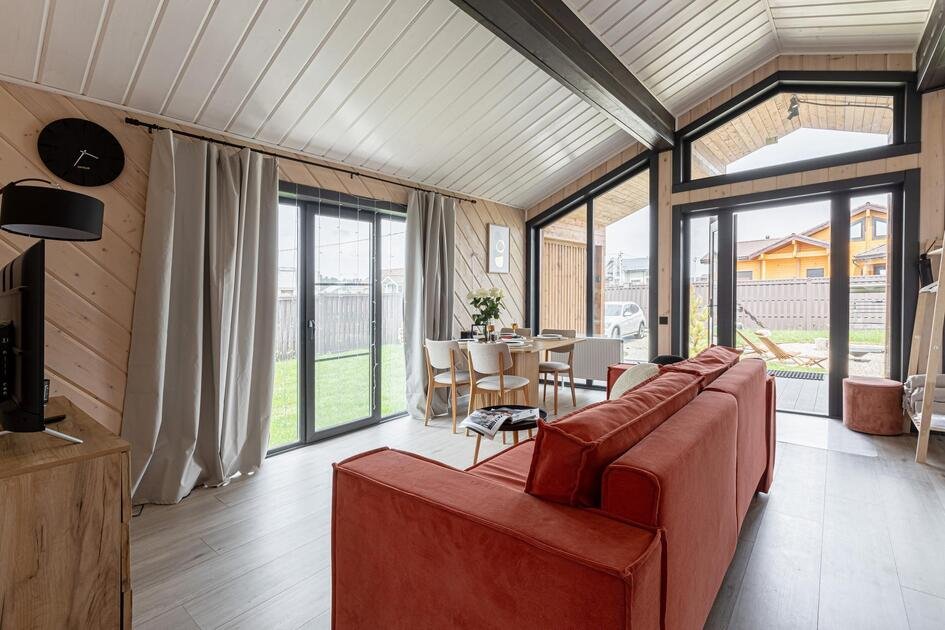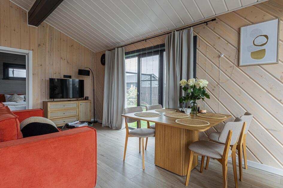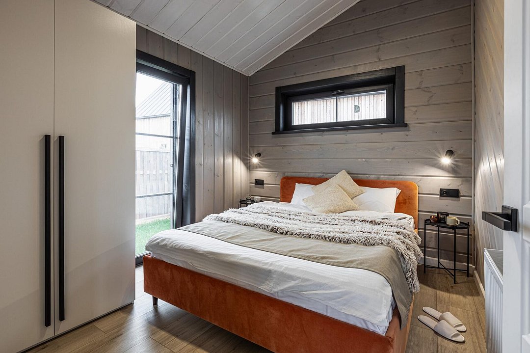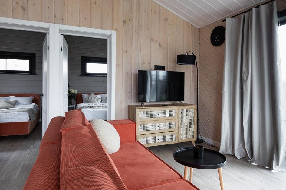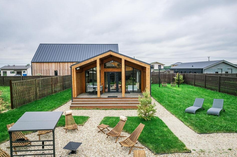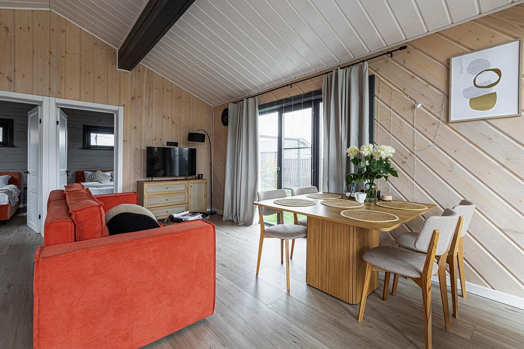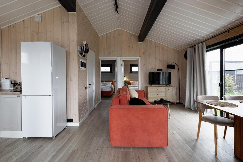 Внутри коттеджа расположены две отдельные спальни с просторными кроватями и кухня-гостиная с раскладывающимся диваном. Все удобства продуманы до мелочей: от современной кухонной техники и стильной мебели до чистого постельного белья, полотенец и гигиенических средств. Каждая деталь интерьера направлена на создание максимального комфорта.