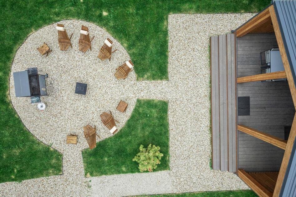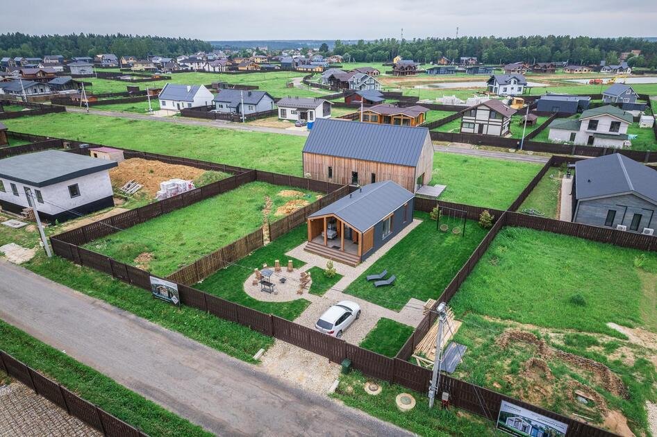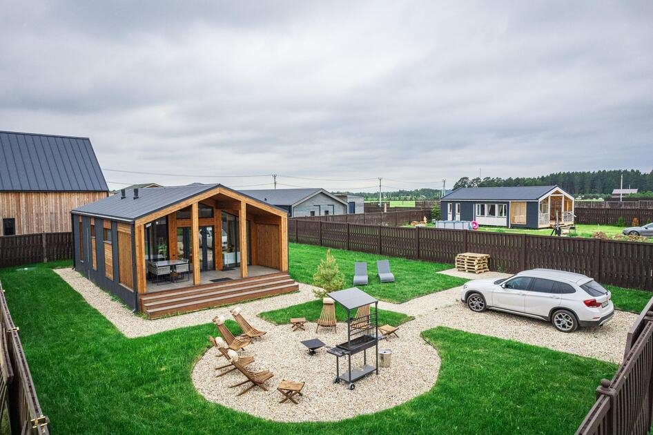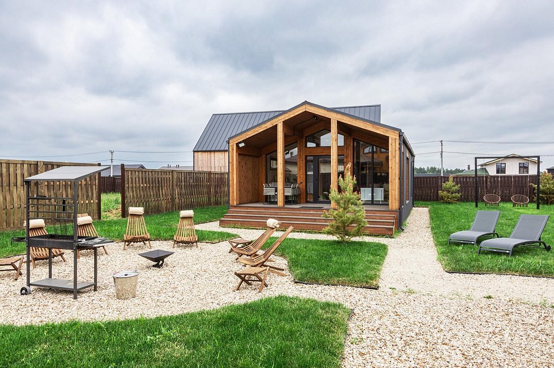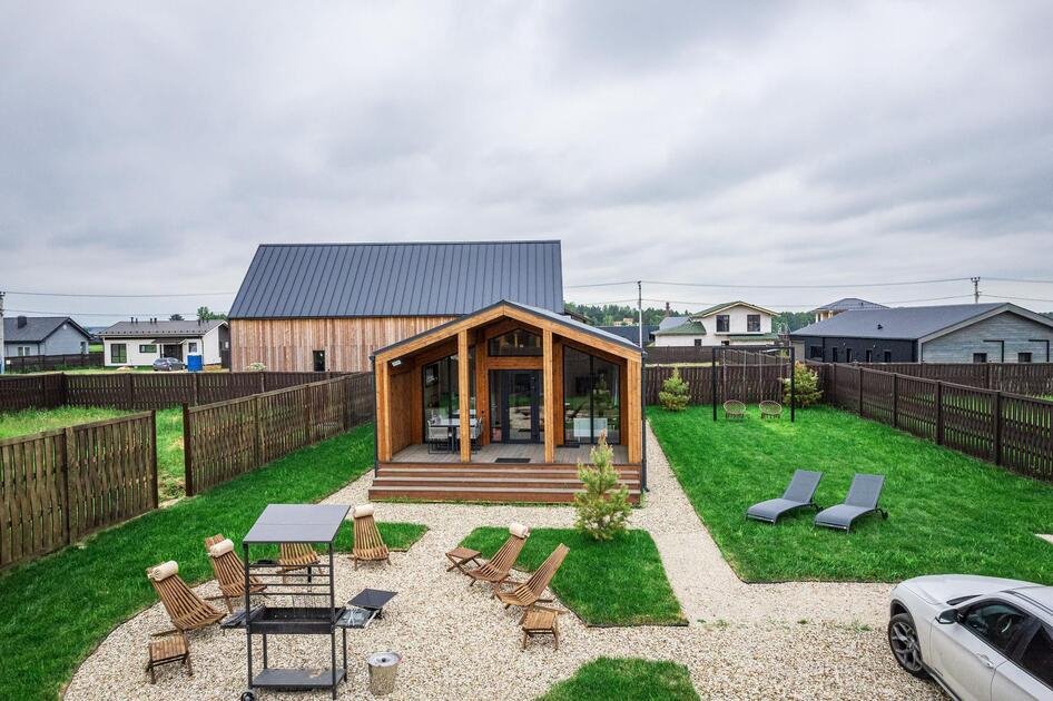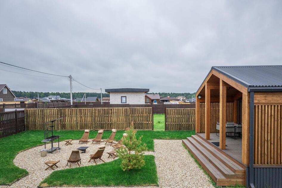 Коттедж расположен на участке площадью девять соток с парковкой, полностью в распоряжении гостей. Здесь есть зона с мангалом и костровище с креслами, особенно уютное вечером, когда листья шуршат под ногами. Терраса идеально подходит для утреннего солнца и завтраков на свежем воздухе. Спокойная атмосфера леса и видеонаблюдение у входа обеспечивают безопасность.