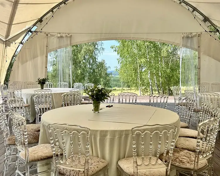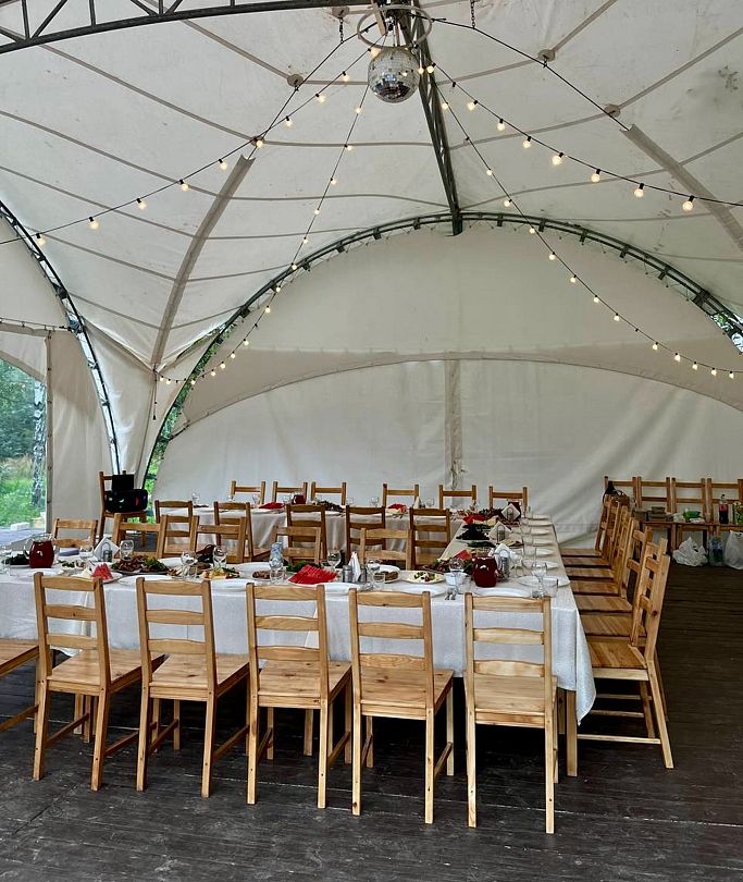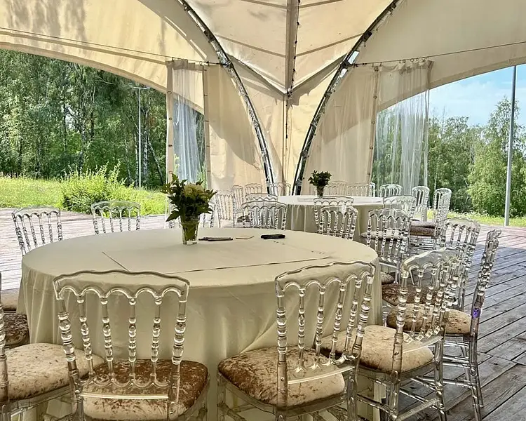 Белоснежный шатер, способный вместить до 60 человек — это идеальное место для незабываемых свадеб, ярких выпускных, стильных корпоративов и торжественных юбилеев, где каждый момент станет поистине особенным. Погрузитесь в атмосферу утонченности и комфорта, наслаждаясь праздником в элегантном окружении на протяжении 6 часов и более.