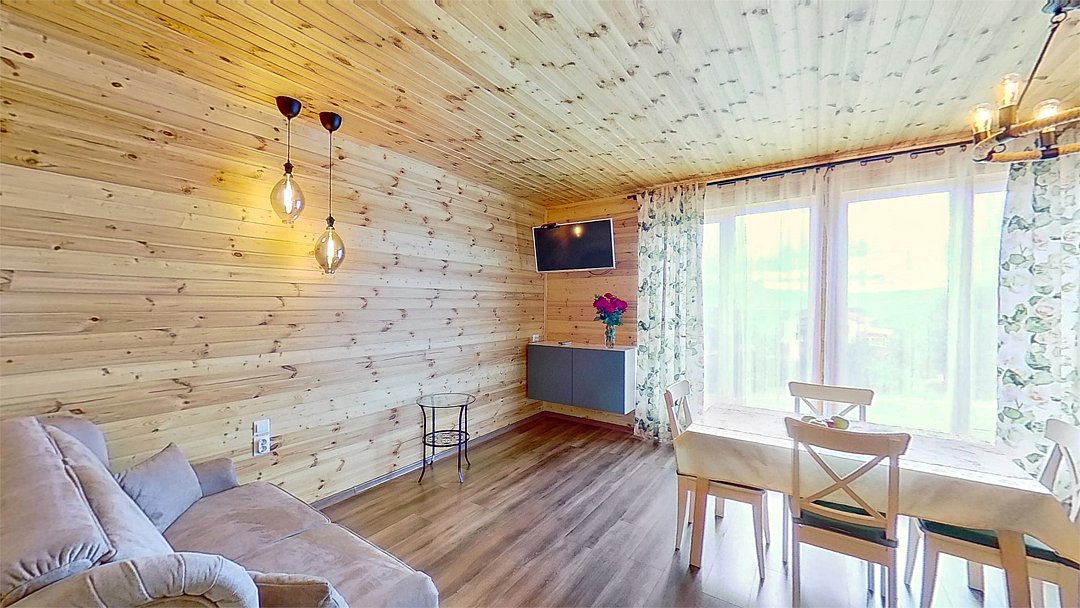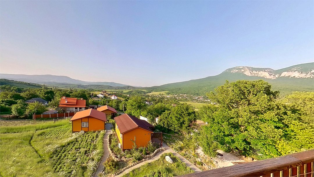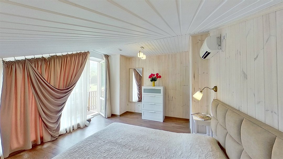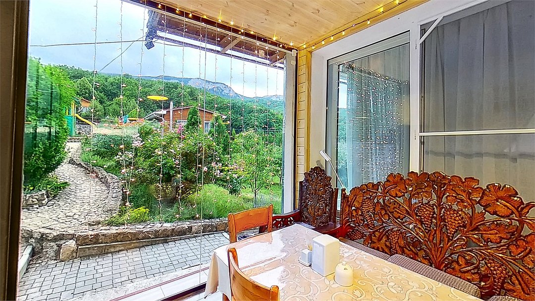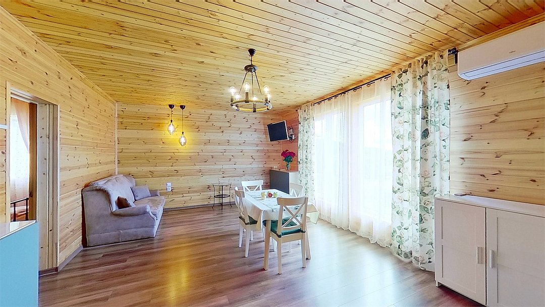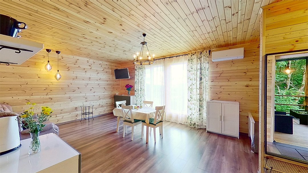 телевизор, спутниковое телевидение, Wi-Fi, холодильник, кондиционер, светильник, фен, ванная комната, терраса, две двуспальные кровати, диван, тумбы, стулья, шкаф для одежды, вешалки, журнальный столик, обеденный стол, зеркало, комод, две комнаты, стул, стол, вид на горы, можно с питомцамиВ коттедже