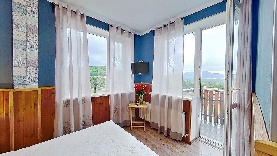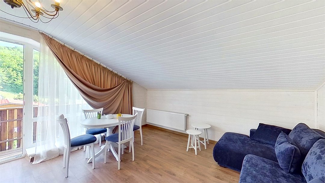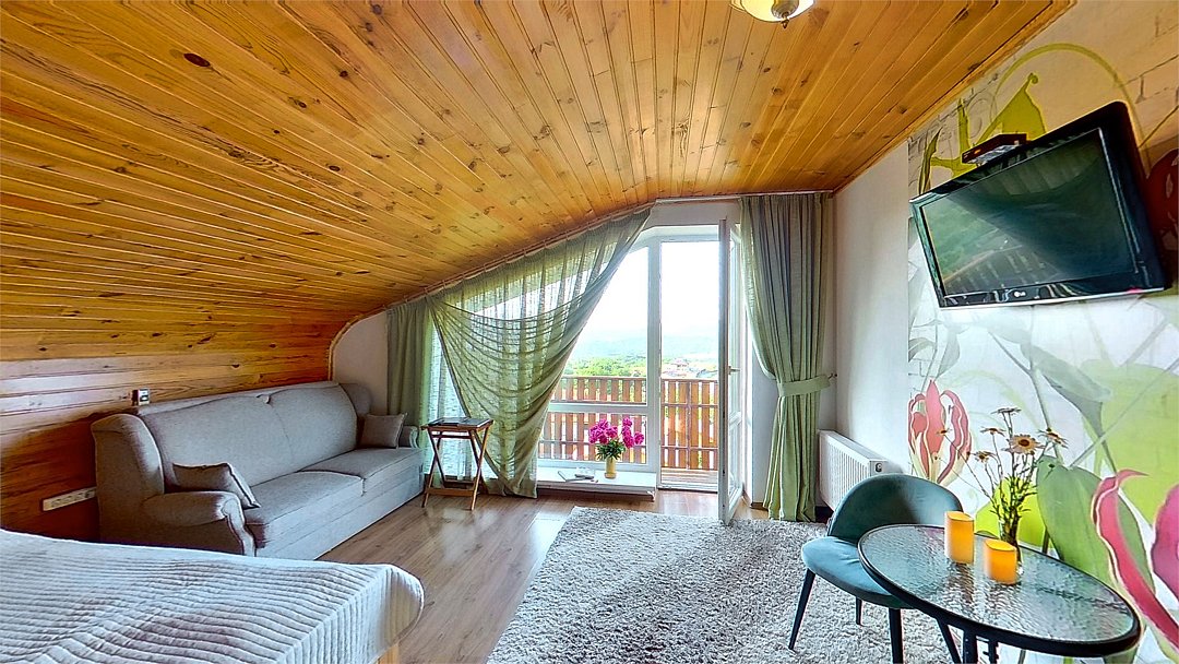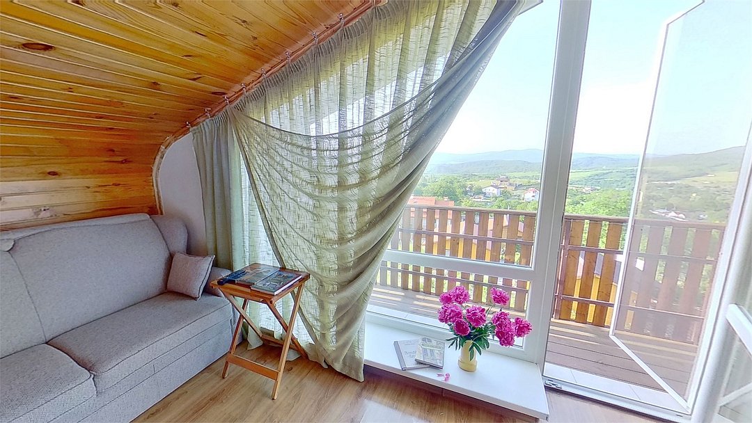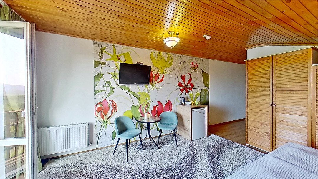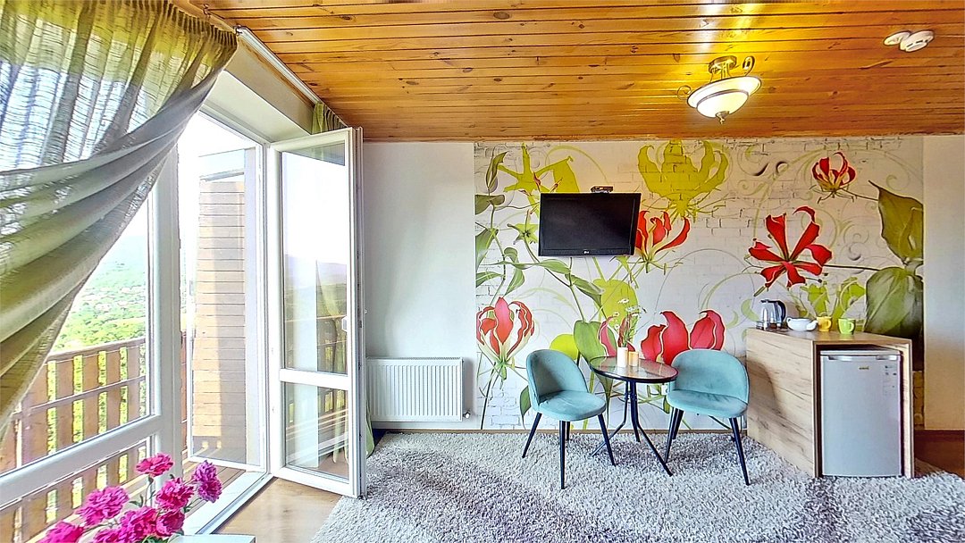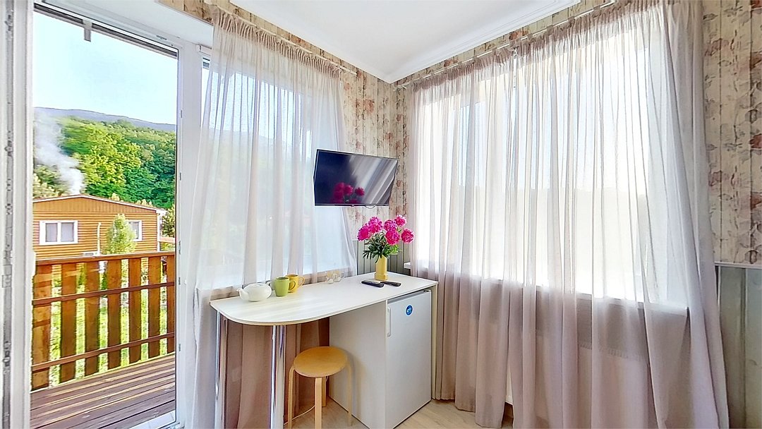 телевизор, Wi-Fi, холодильник, кондиционер, санузел, балкон, двуспальная кровать, диван, стулья, шкаф для одежды, зеркало, душ, стол, тумба, раскладной диван, вид на горы, можно с питомцамиВ номере