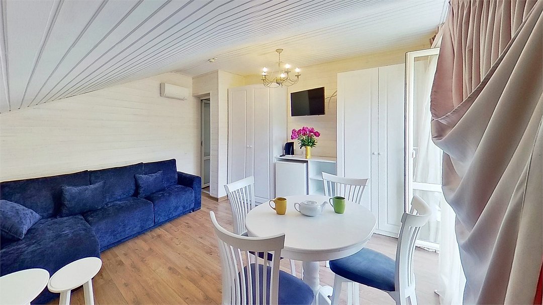 телевизор, Wi-Fi, холодильник, кондиционер, фен, ванна или душевая кабина, санузел, биде, балкон с красивым видом, двуспальная кровать, ортопедический матрас, диван, стулья, шкаф для одежды, вешалки, обеденный стол, панорамные окна, можно с питомцамиВ номере