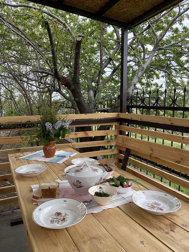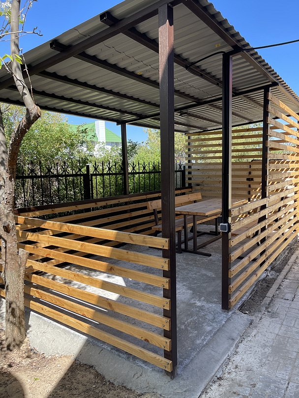 Каждый гостевой дом имеет свою отдельную беседку со столом и лавочками.