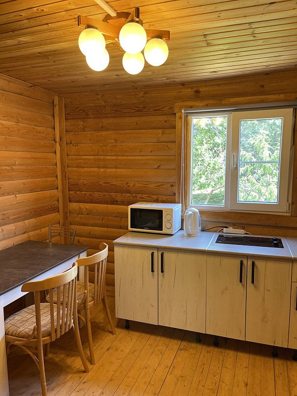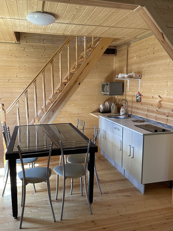 Каждый гостевой дом оснащен кухонной зоной со всеми необходимыми для приготовления пищи принадлежностями и бытовой техникой (холодильник, электрическая плита, микроволновка, электрический чайник, посуда).