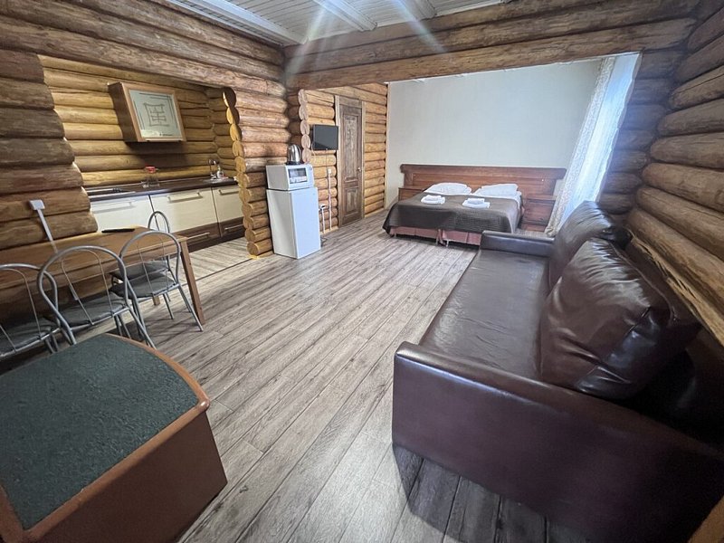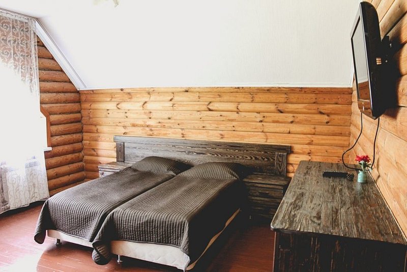 Коттедж рассчитан для проживания 10 гостей (максимально 15 гостей). Оснащен всем необходимым: шкаф для одежды, диван, прикроватные тумбы, 3 TV, микроволновка, чайник, холодильник, набор посуды, обеденный стол, санузел с душевой кабиной.