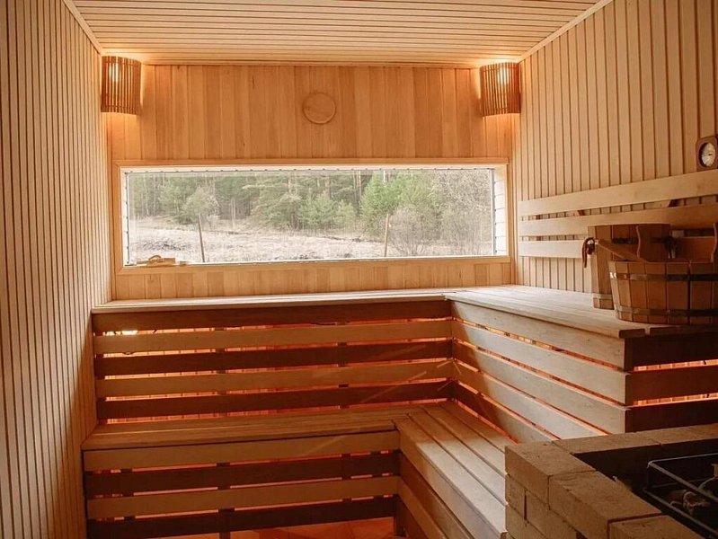 На первом этаже просторная кухня и обеденная зона с раскладным диваном, своя сауна и оборудованная мангальная зона, а на втором этаже – 4 отельные спальни. Вместительность до 10 человек. Всё очень красиво, уютно и комфортно.