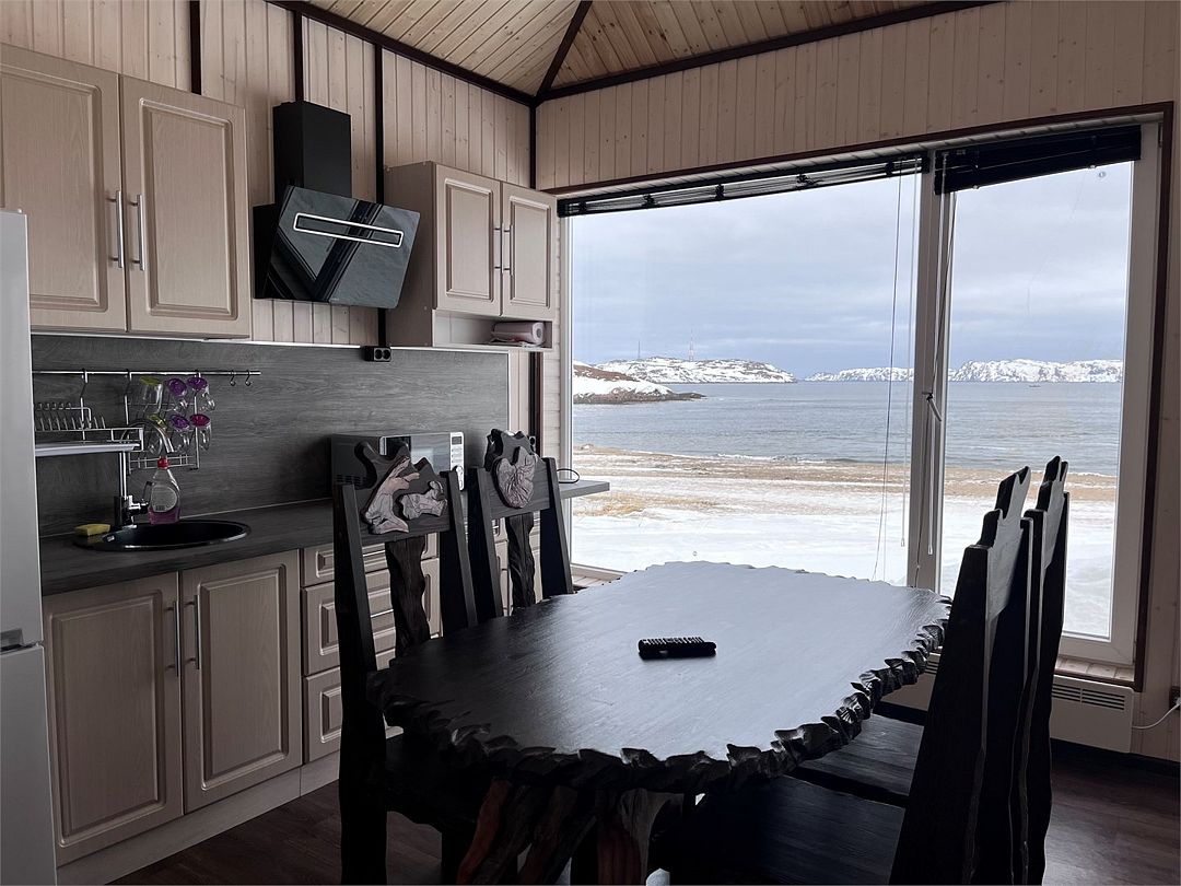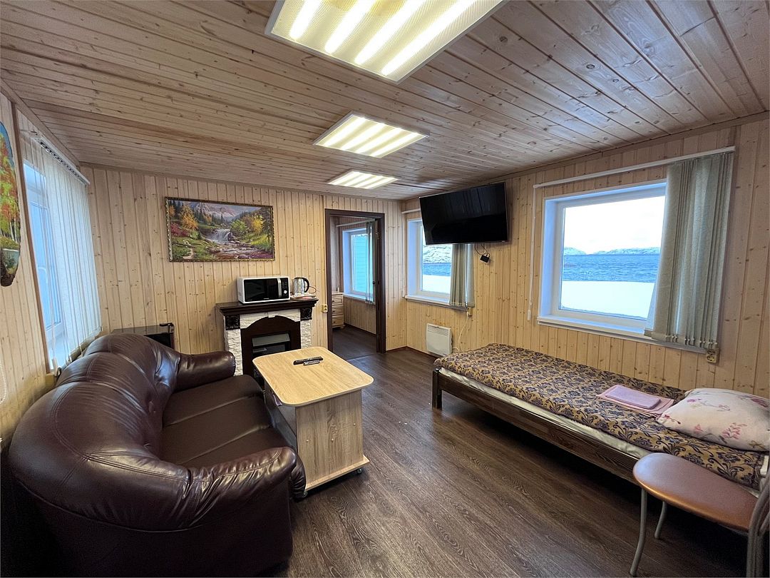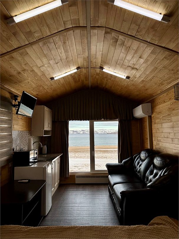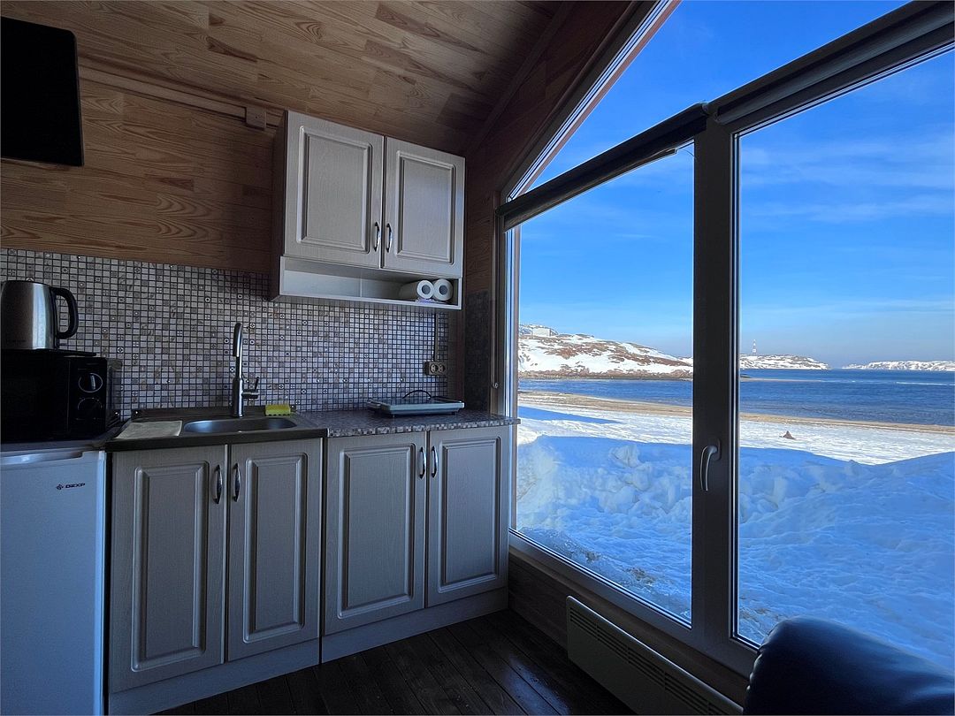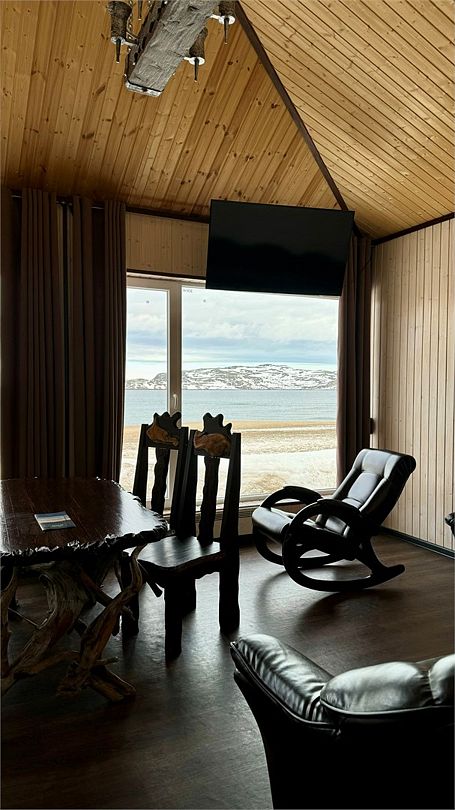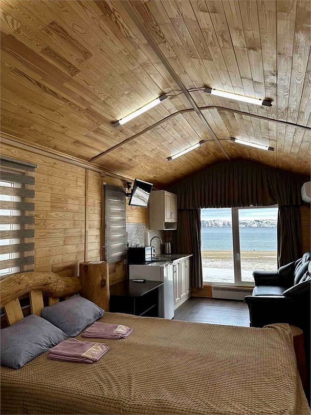 Насладитесь единением с природой в новом доме на берегу Баренцева моря с панорамными видами на бескрайние просторы и песчаный пляж. Уникальная локация позволяет просыпаться под шум прибоя, встречать незабываемые рассветы и любоваться северным сиянием прямо из спальни. Архитектура и планировка: • Панорамная спальня с видом на море и двуспальной кроватью • Функциональная кухонная зона, полностью укомплектованная техникой (холодильник, электрическая плитка, чайник) и набором посуды • Гостиная зона с кожаным диваном-трансформером (дополнительное спальное место) • Ванная комната с душевой кабинойУслуги и удобства