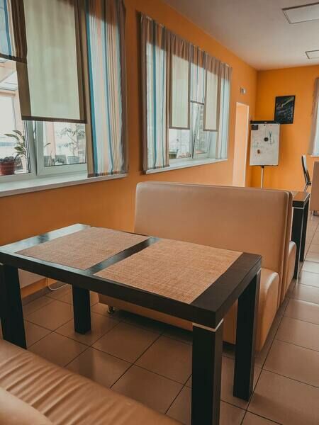 В ресторане стоит мягкая мебель, а на полах декоративная плитка.