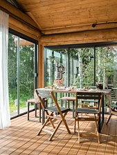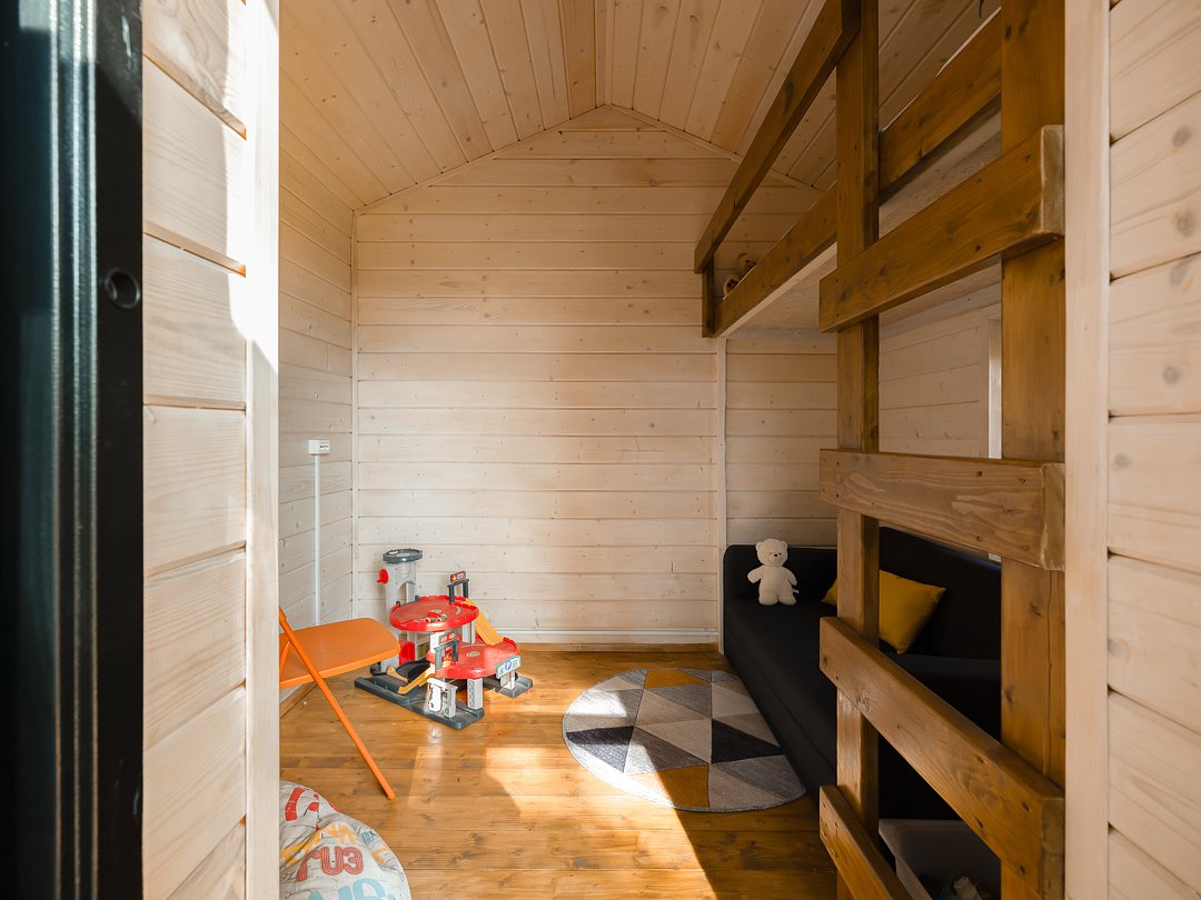 Здесь вас ждет продуманное пространство, объединяющее спальню, кухню-гостиную и современный санузел с душевой. Снаружи расположена просторная застеклённая веранда, мангал с навесом и грилем, уютная костровая чаша, а также парковка на два автомобиля с автоматическими воротами. Для детей оборудован игровой домик на дереве, а для вечернего отдыха — ночная подсветка костровой зоны и большая лужайка для игр на свежем воздухе.