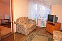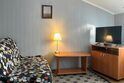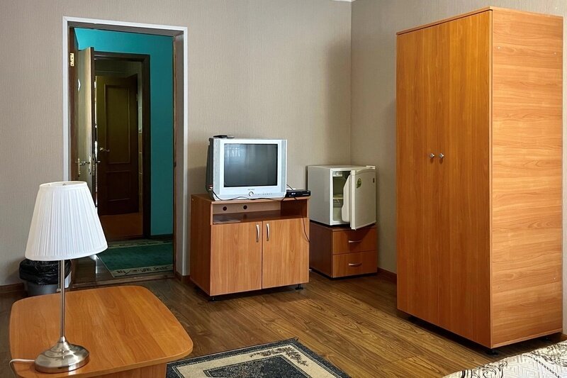 - В двухкомнатном номере: двуспальная кровать, прикроватная тумба, диван, платяной шкаф, телевизор, холодильник.