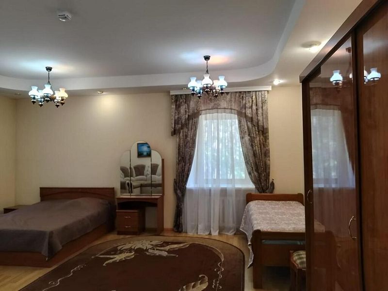 Однокомнатный номер c двуспальной кроватью и односпальная кровать. Прикроватные тумбочки, трюмо, шкаф, диван на два места и кресло. Также в номере имеется шкаф, комод с зеркалом. В ванной комнате установлен душ и предоставляется набор косметических принадлежностей.