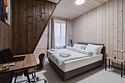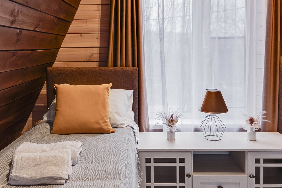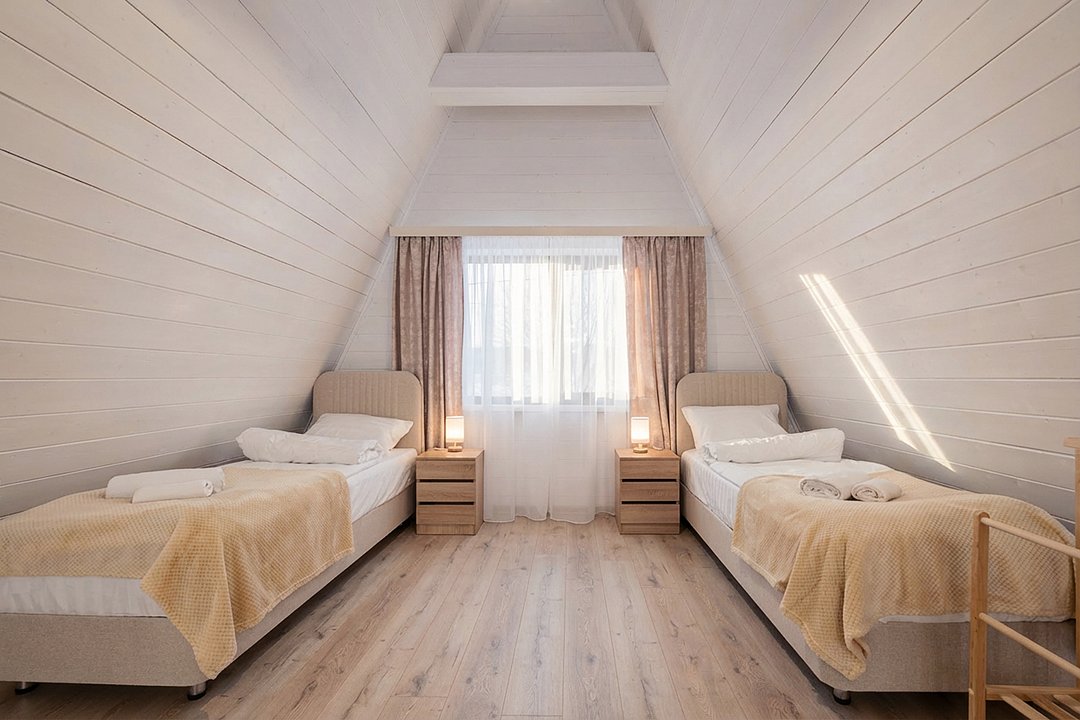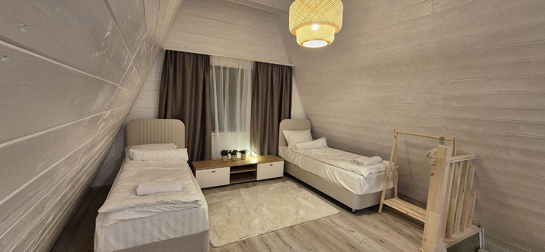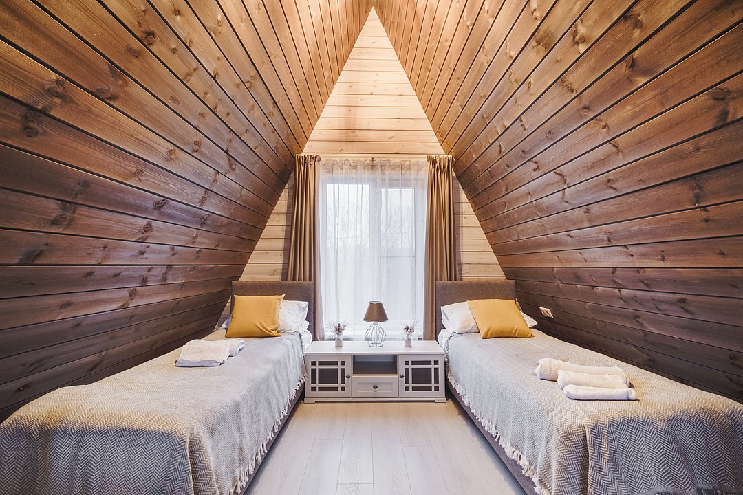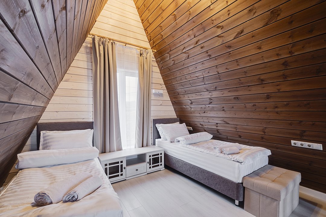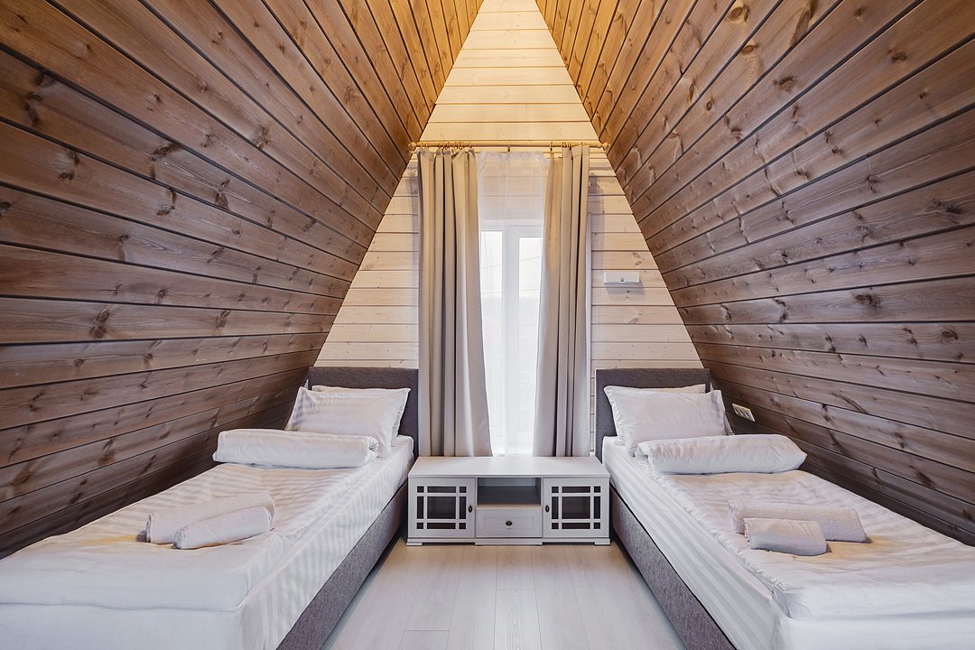 Две односпальные кровати, две двуспальные кровати, одна диван-кроватьВ а-фрейме