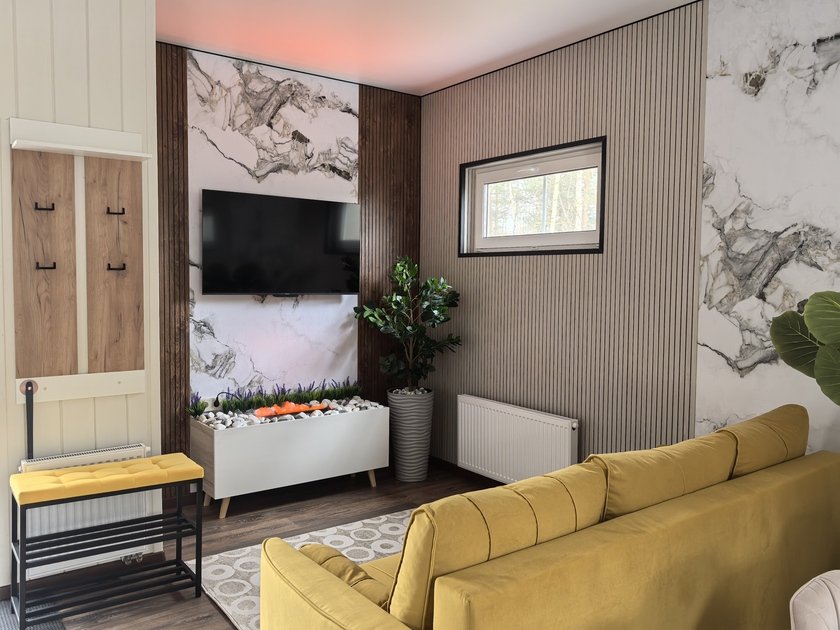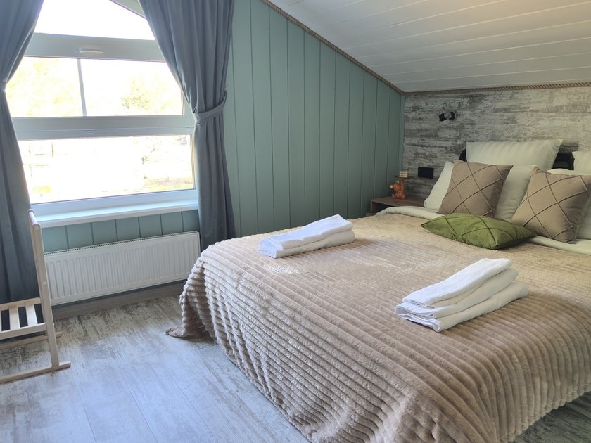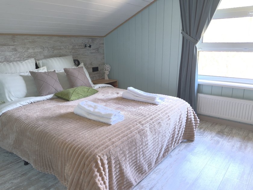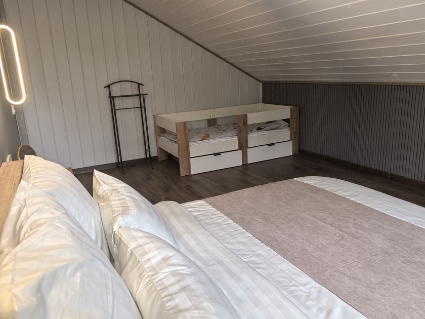 Для удобства в доме на втором этаже две изолированные комнаты с двуспальными кроватями, в одной есть детская кроватка, также в холле на втором этаже раскладной диван. На первом этаже раскладной диван. Дом полностью оборудован всей необходимой для проживания техникой и посудой на восемь гостей.