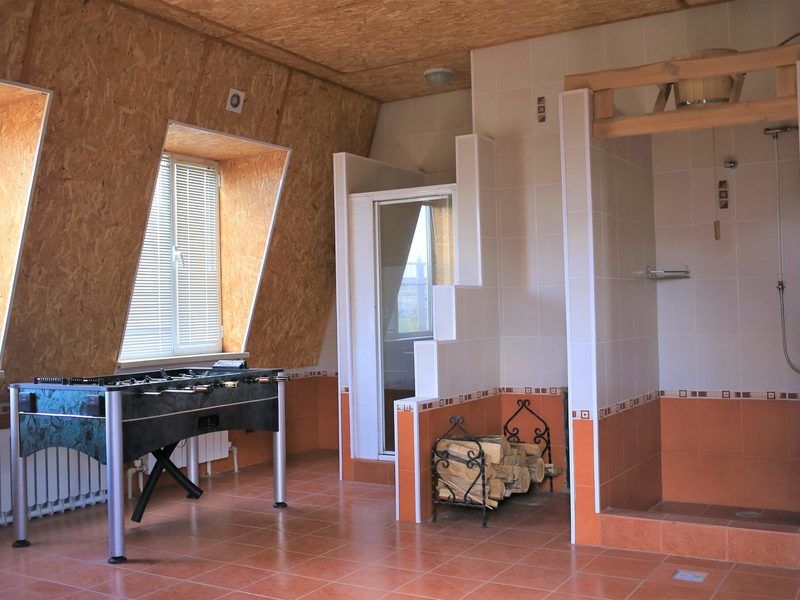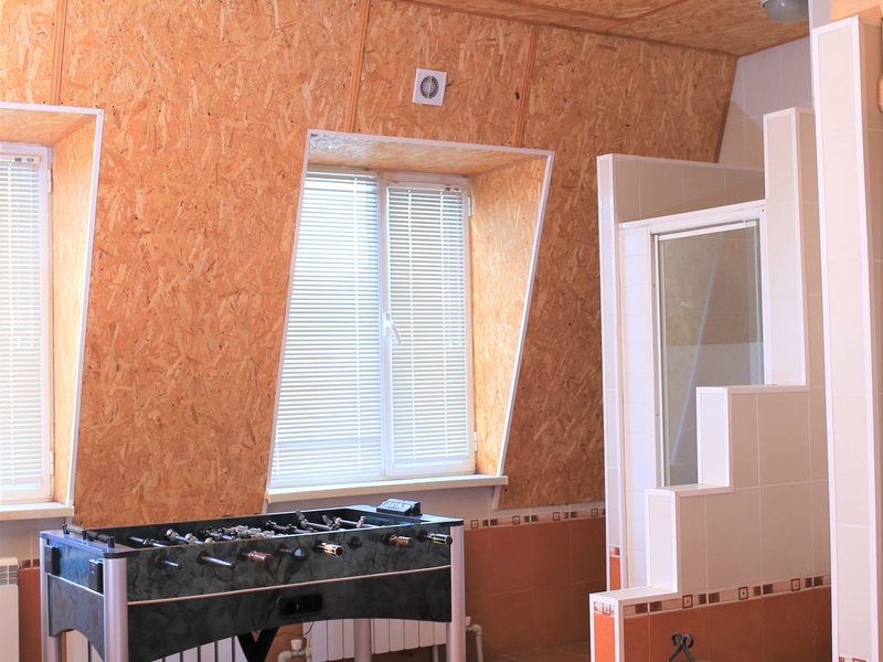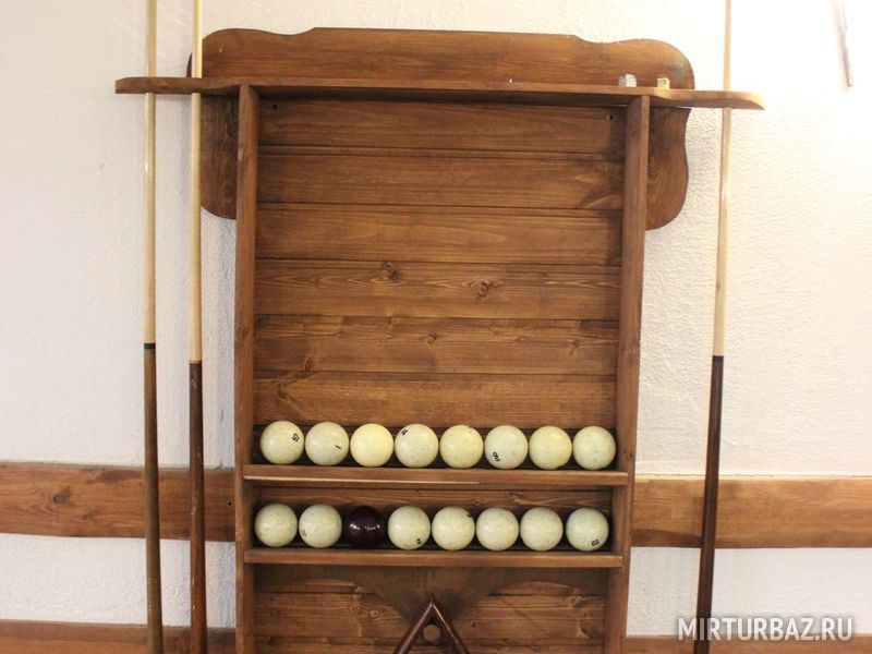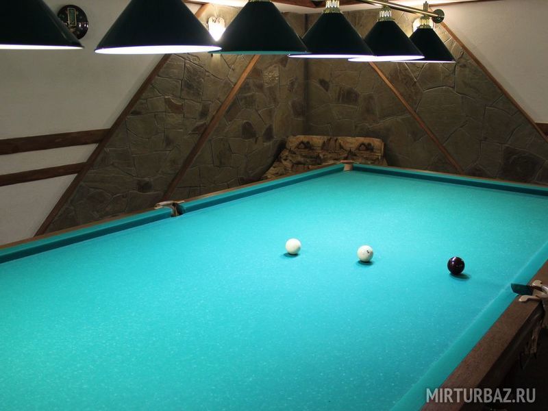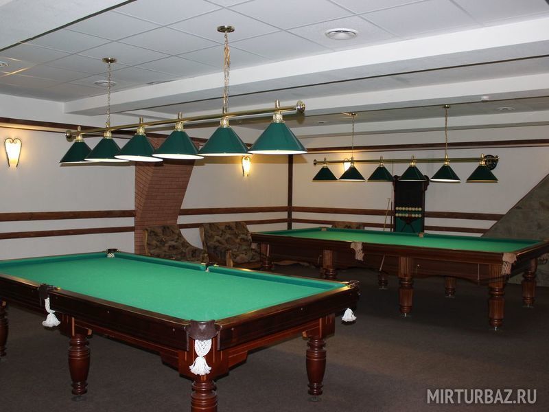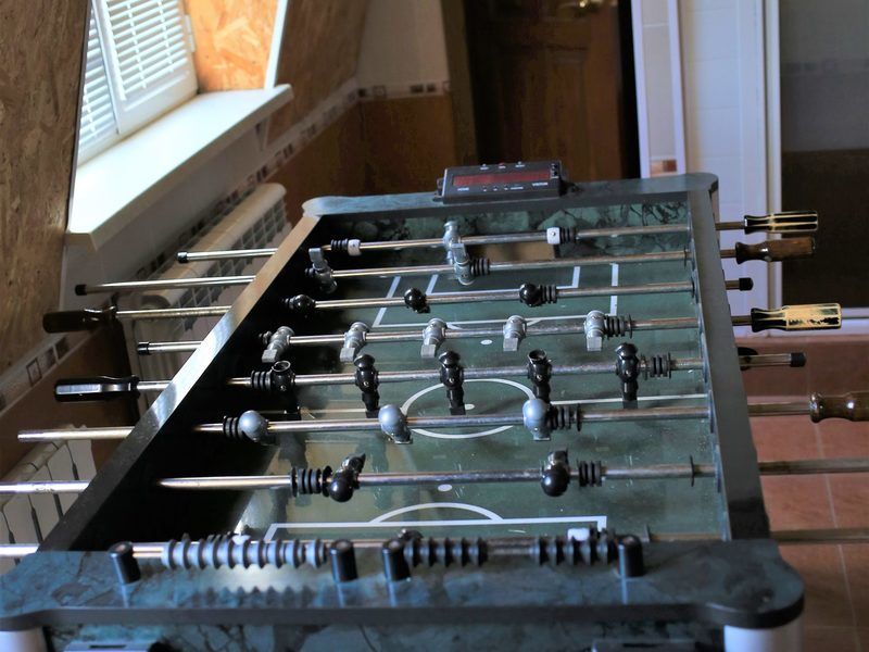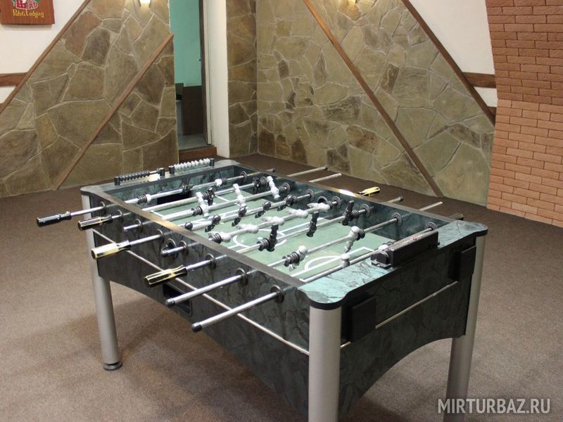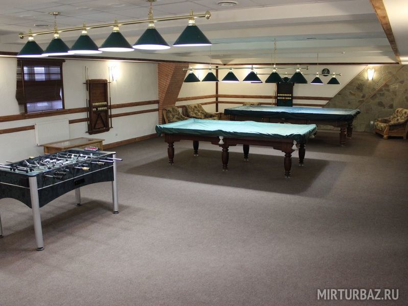 Имеется 2 стола для русского бильярда и настольный футбол.