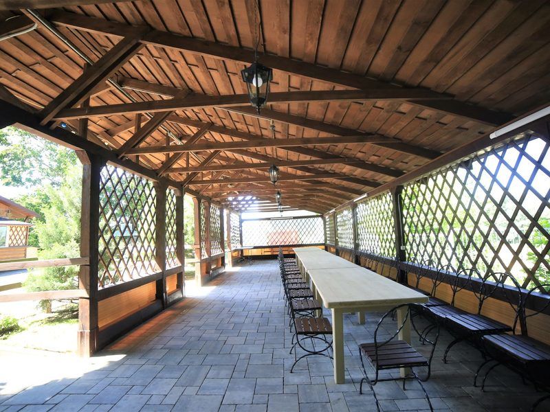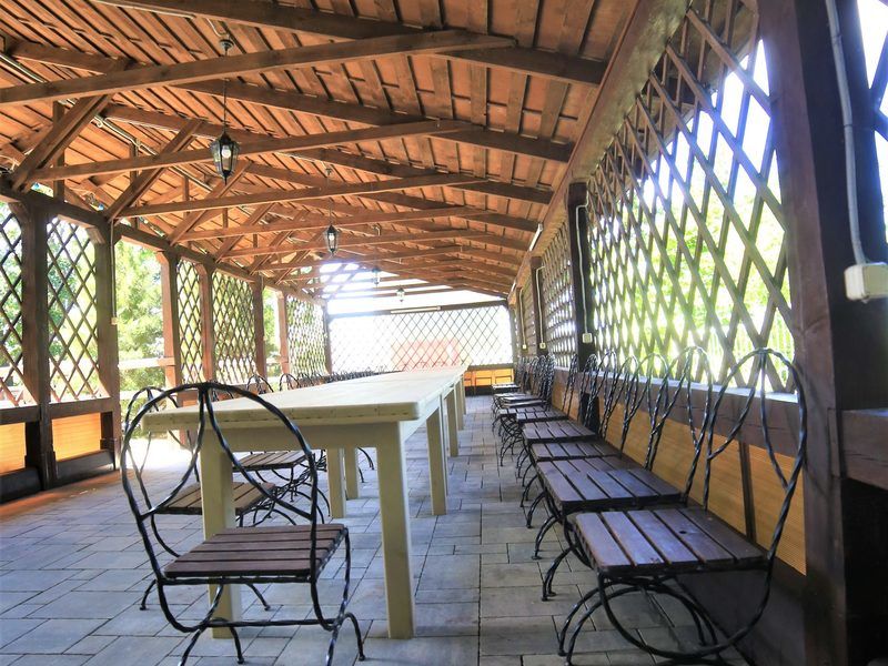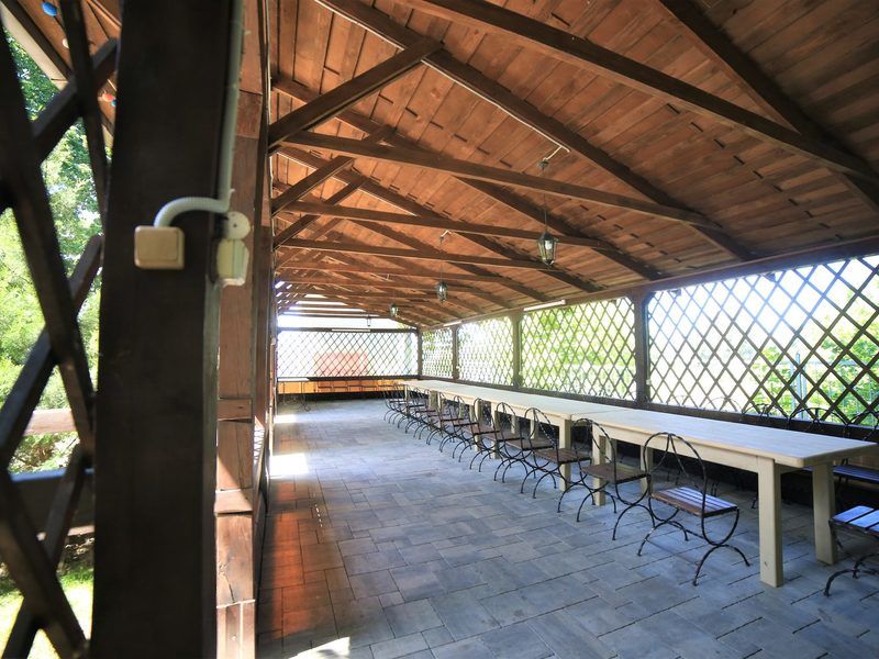 **охраняемая парковка, туалетные комнаты, рукомойники на территории.Главная беседка до 70 человек