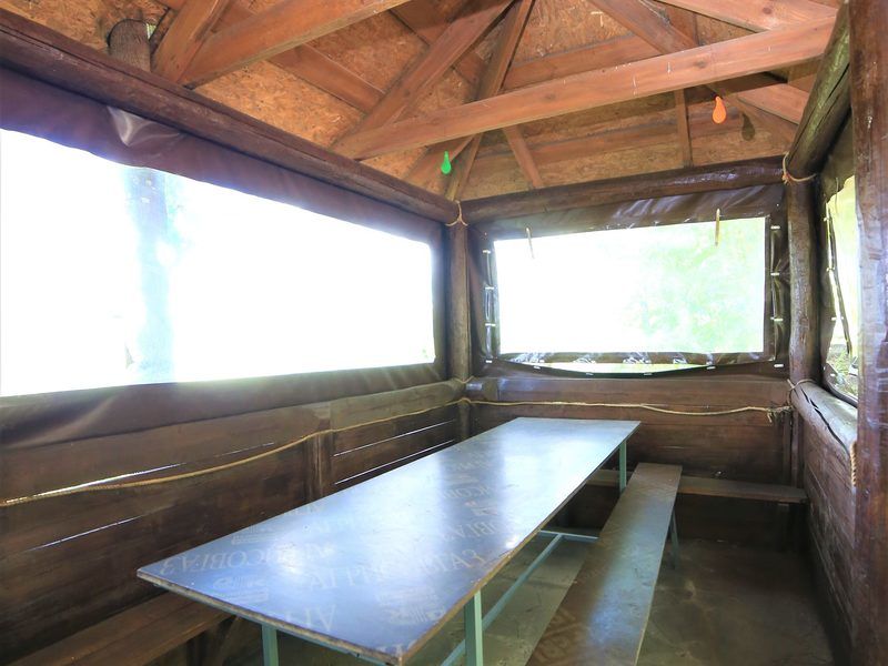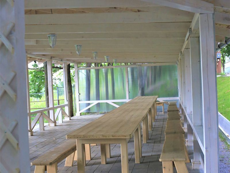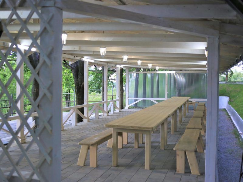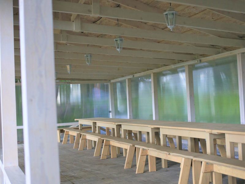 Мангальная зона + площадка для дискотеки/ разных форматов активностей/ фотозоны. В беседке есть свет и розетки. Свой выход к реке и волейбольной площадке.Цена указана за одного человека.