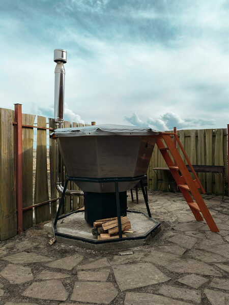 Именно такое парение считается полезным и правильным. Печь установлена под чаном. Так горячая вода поступает снизу вверх.