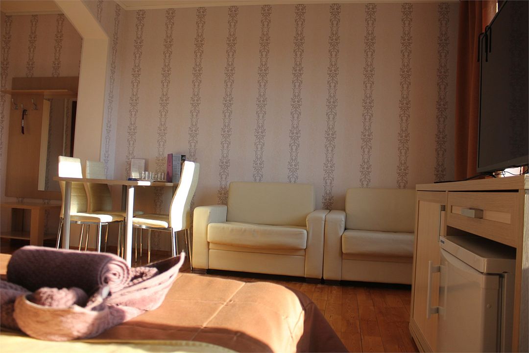 Мягкая диванная группа, двухстворчатый шкаф, телевизор, холодильник, электрочайник, посуда, халаты и тапочки, душевая кабина, водонагреватель, фен и банные принадлежности, кухонная зона, плита, терраса, балкон, санузел совмещенный, информационная карта, меню, обслуживание номеров.
