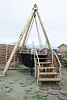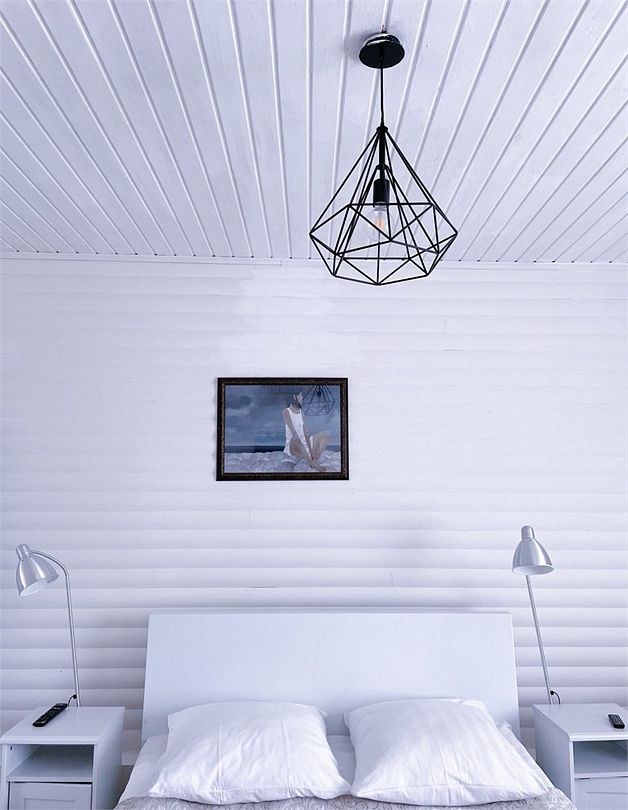 На первом этаже расположены кухня-гостиная и ванная комната, двуспальная кровать и раскладной диван, на втором этаже — дополнительное спальное место размером 140 на 200.