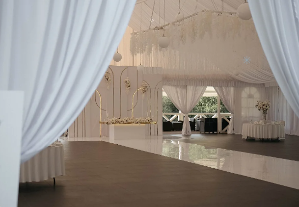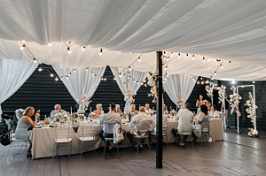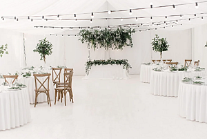 Белоснежный шатёр для грандиозных торжеств! Общая площадь шатра — 400 кв. метров, вместимость — до 250 гостей. Оборудован собственной террасой и зоной для выездных церемоний — понтоном на воде.
