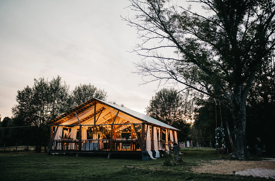 Шатёр у стен исторической усадьбы Елизаветы Голицыной. Общая вместимость — до 70 человек. Собственная зона для выездных церемоний в тени деревьев и с видом на конюшню.