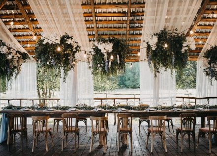 Стилизованная открытая площадка общей вместимостью до 45 гостей. Декорирована белой вуалью и вечерними фонариками. Оборудована костровой зоной.