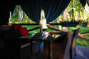 Стоимость аренды беседки при заказе банкета — 30 000 ₽. Стоимость аренды без заказа банкета — 60 000 ₽.