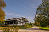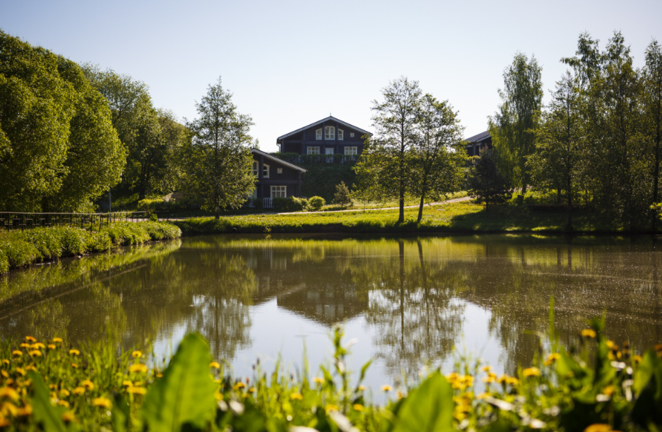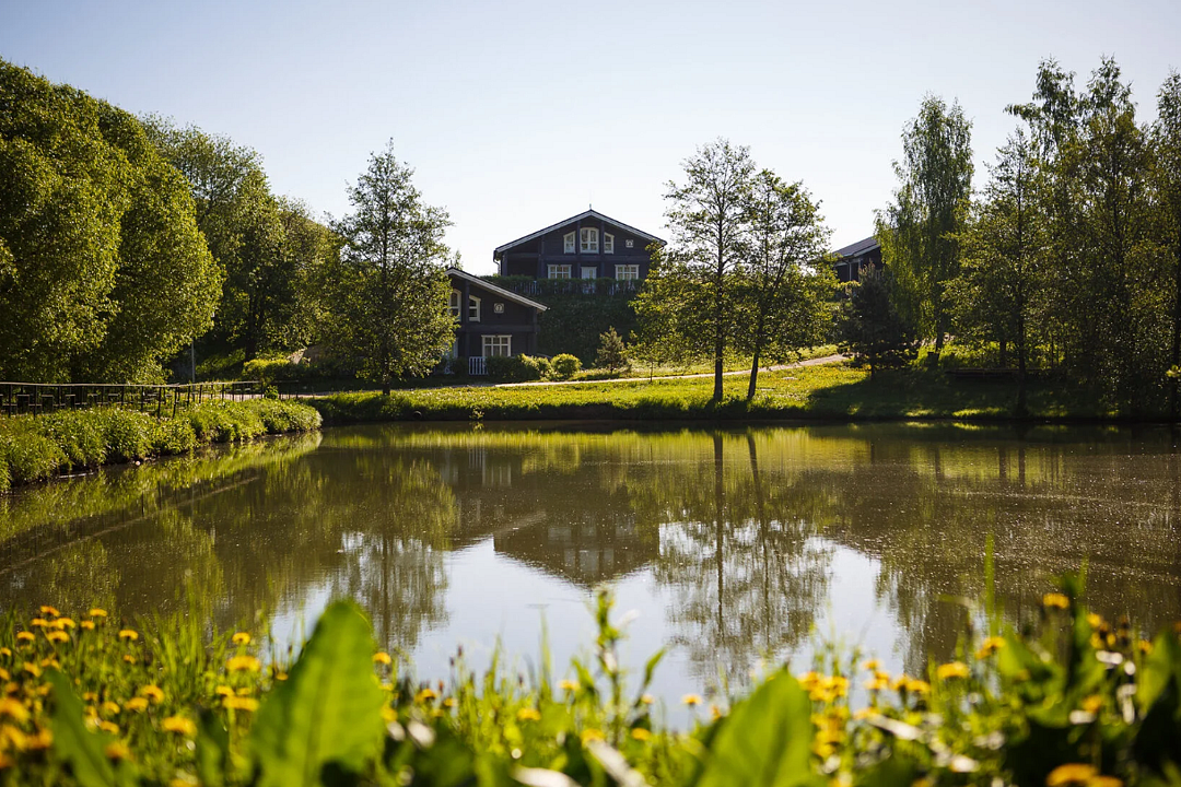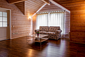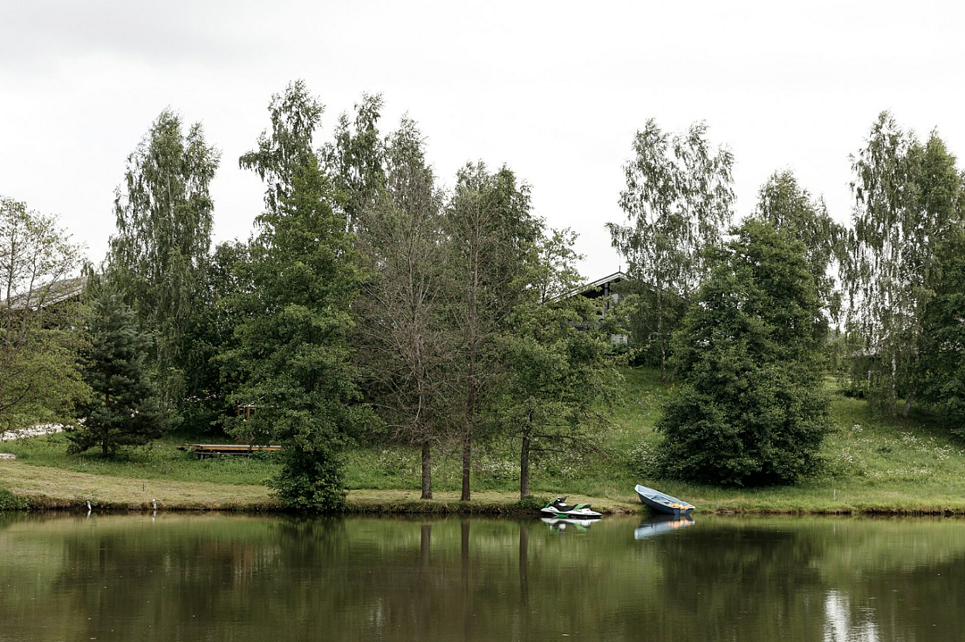 Пастельные тона в сочетании с натуральными материалами и видовыми окнами по всему периметру дома создают пространство и открывают великолепный вид на форелевый пруд
