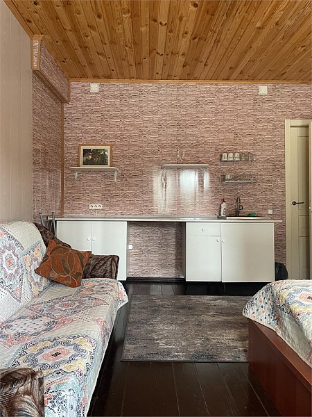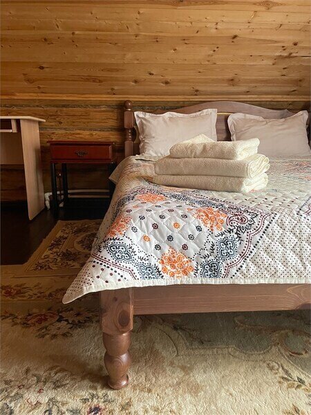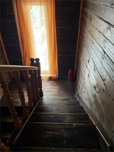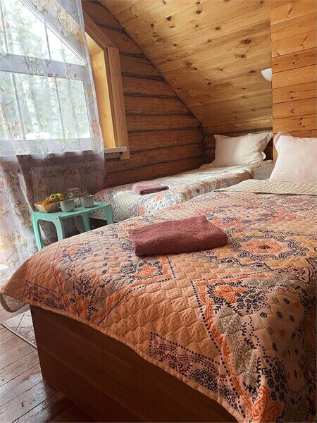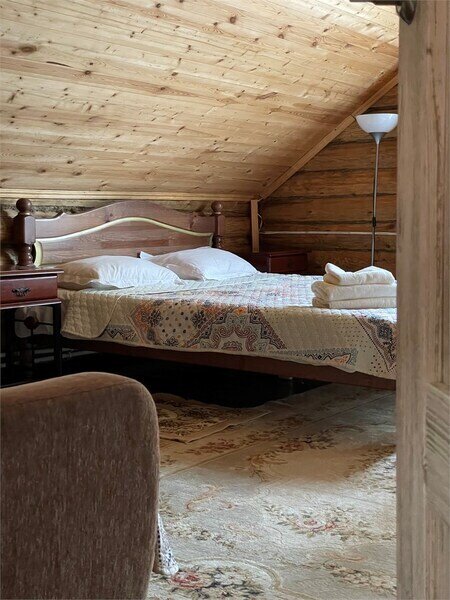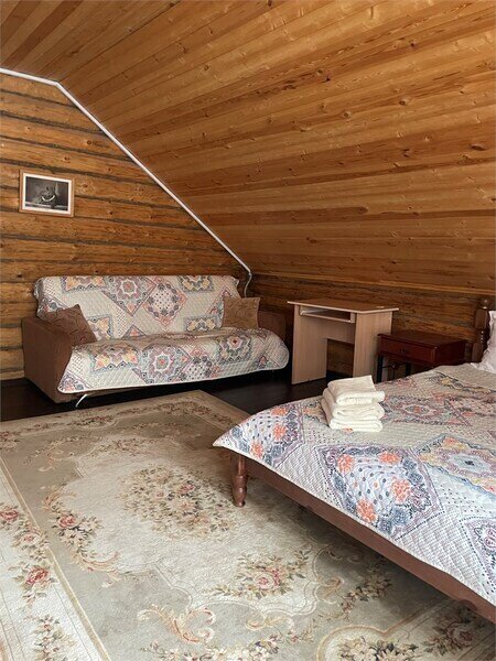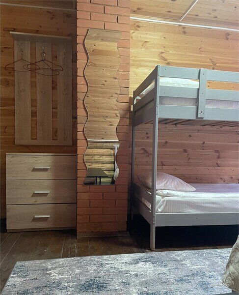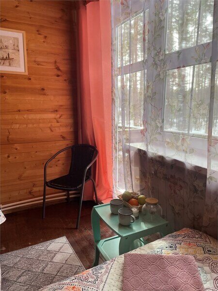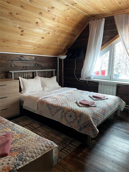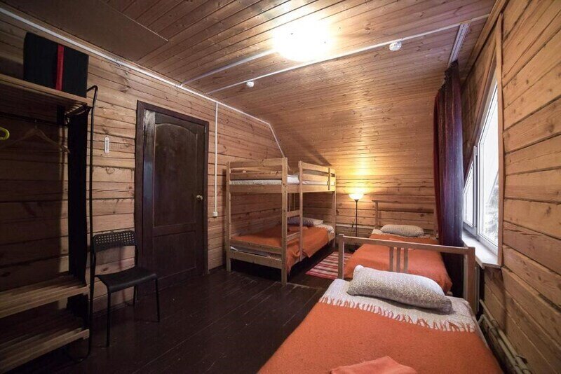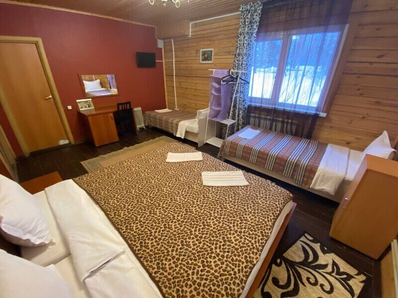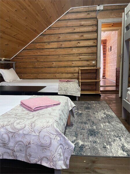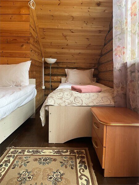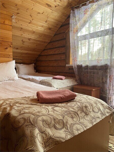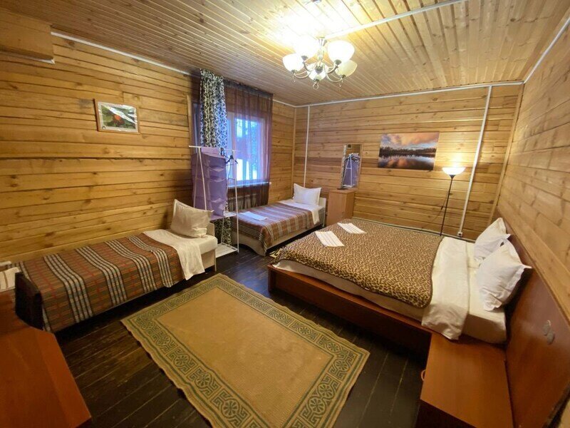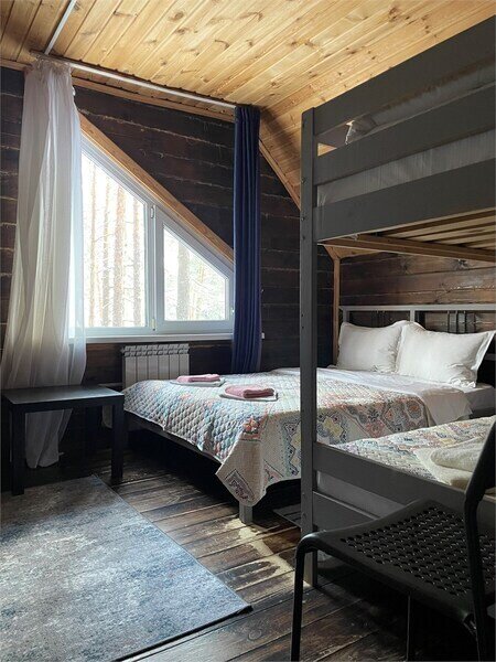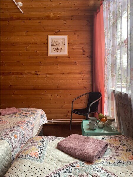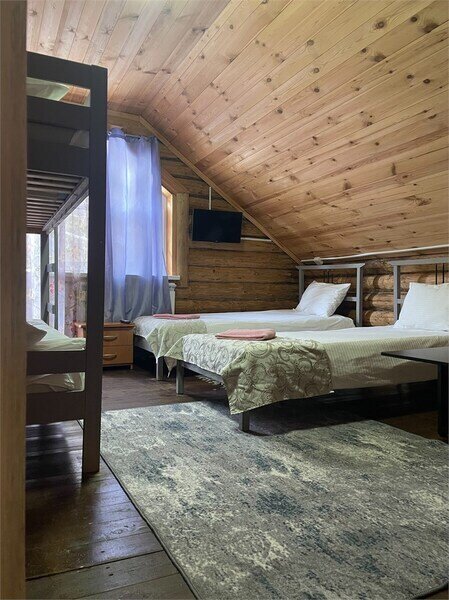 Однокомнатный номер с двумя полутороспальными и одной двухъярусной кроватями расположен на втором этаже деревянного коттеджа, в котором всего 4 номера: один номер на первом этаже и 3 номера на 2 этаже.