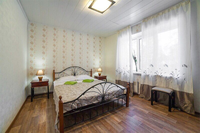 Номер «Апартаменты» с двумя односпальными кроватями спринг бокс расположен на первом этаже деревянного коттеджа (из бруса), в котором всего 5 номеров: два номера на первом этаже и 3 номера на 2 этаже.