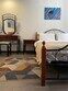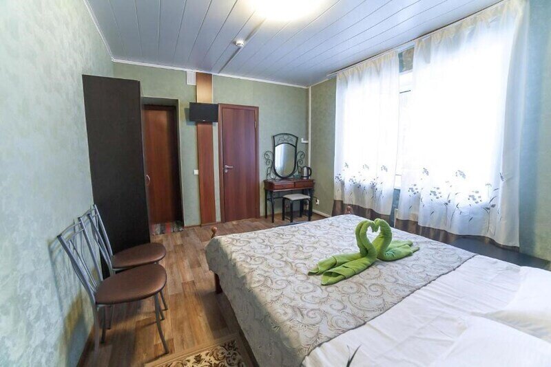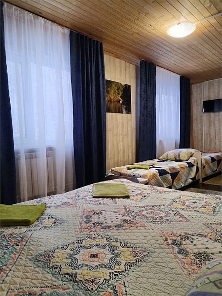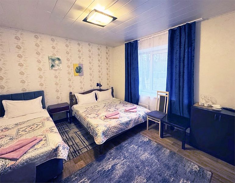Однокомнатный номер с одной двуспальной и одной односпальной кроватями расположен на втором этаже гостевого дома.