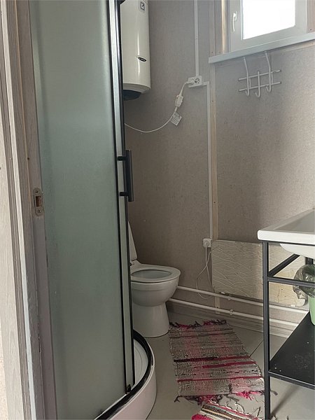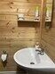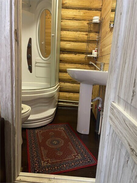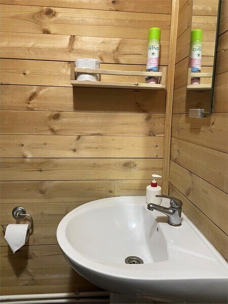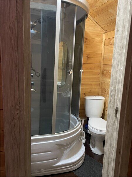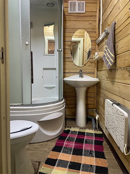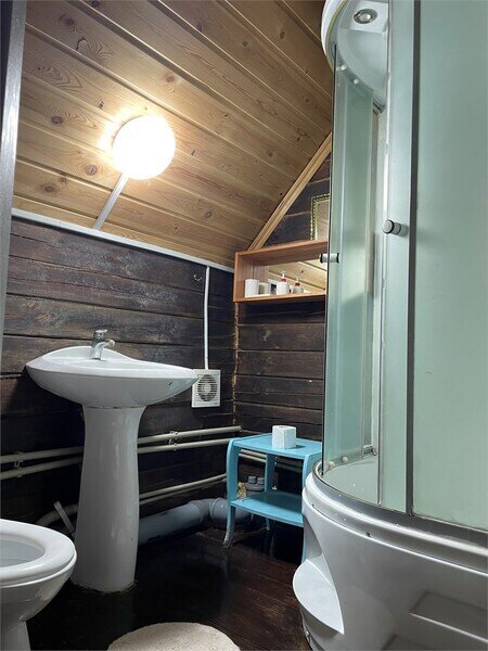 Вторая — с двумя односпальными кроватями. Третья — с одой двухъярусной кроватью. В домике есть совмещенный санузел с душевой кабиной, жидкое мыло, набор полотенец.