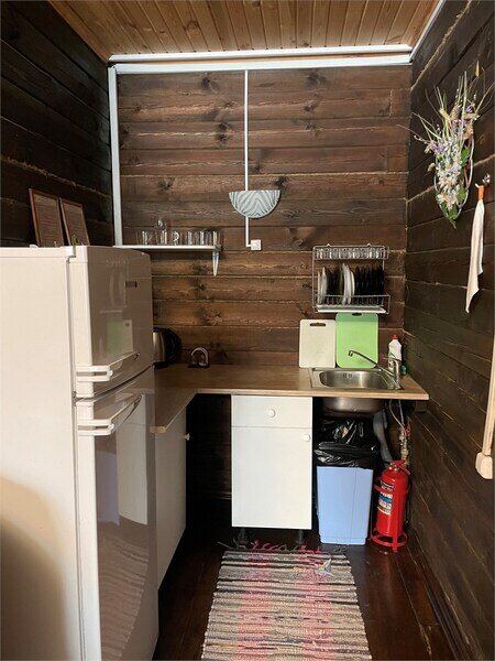 В коттедже есть общий холл и мини-кухня, оборудованная холодильником, микроволновой печью, электрическим чайником, посудой.