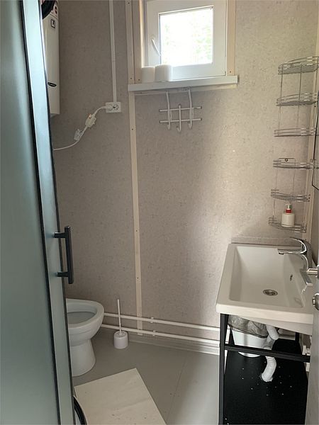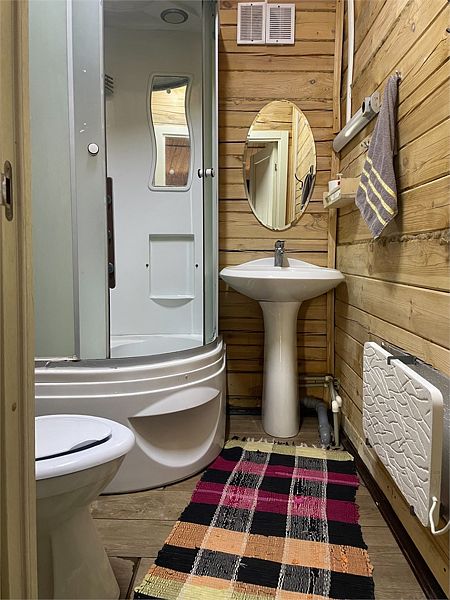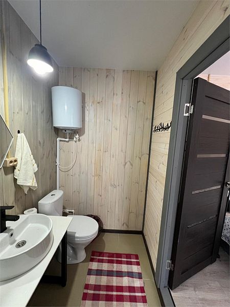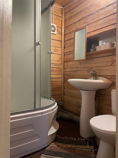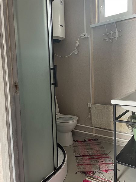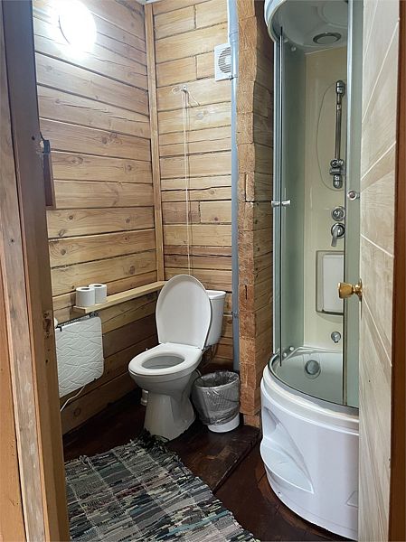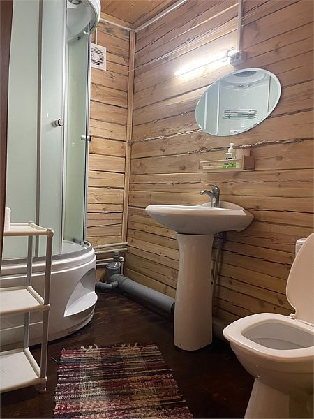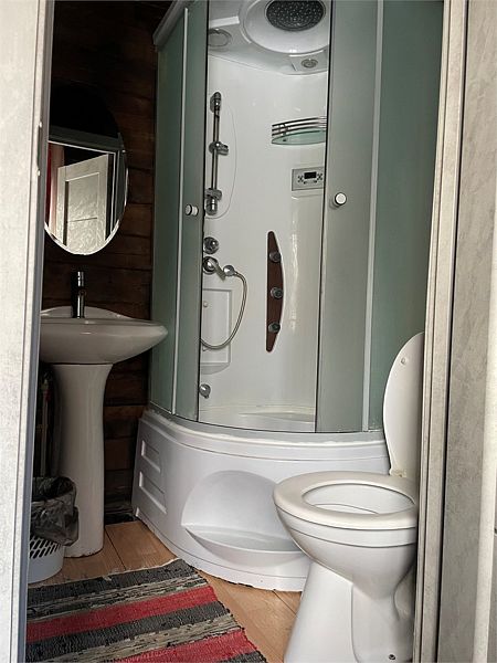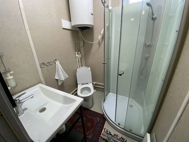 И на первом и на втором этаже — санузлы с душевой кабиной. Первый этаж имеет небольшую кухонную зону с холодильником, СВЧ печью, чайником и посудой.