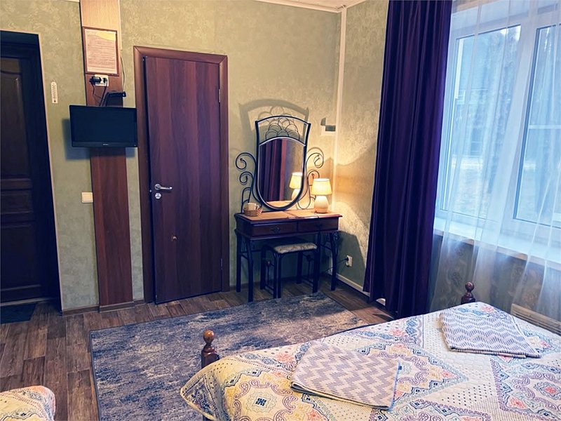 Номер оборудован туалетным столиком с зеркалом, прикроватными тумбами, стульями, шкафом для одежды с вешалками. В распоряжении гостей есть чайный набор (чай/кофе), электрический чайник. Ванная комната с душевой кабиной/ванной укомплектована банными полотенцами. Дополнительно гость может приобрести тапочки и косметические средства.