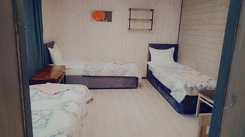 Стандартный номер с тремя односпальными кроватями расположен в деревянном коттедже (из бруса), в котором всего 5 номеров: два номера на первом этаже и 3 номера на 2 этаже.