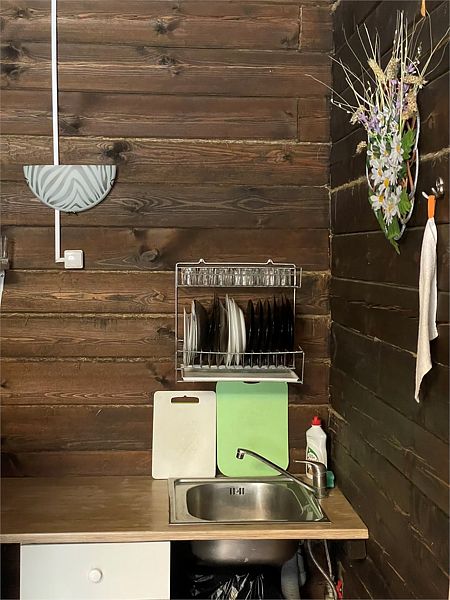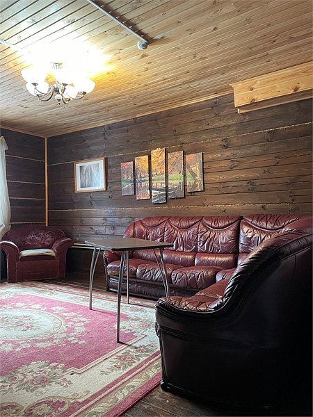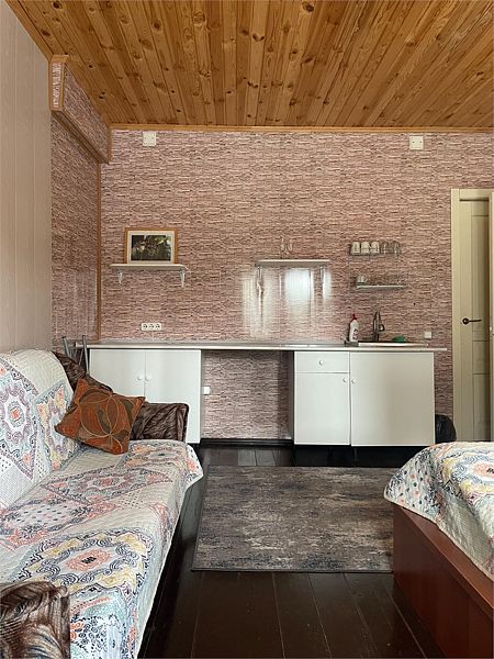В доме есть мини-кухня, оборудованная холодильником, микроволновой печью, электрическим чайником, посудой и просторный холл с удобным диваном.