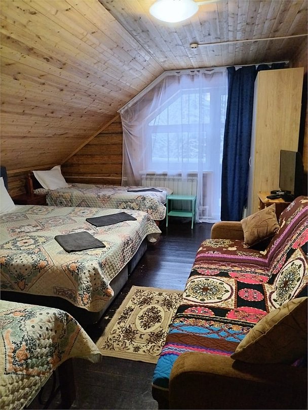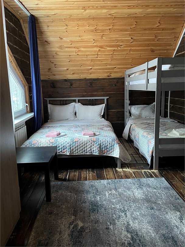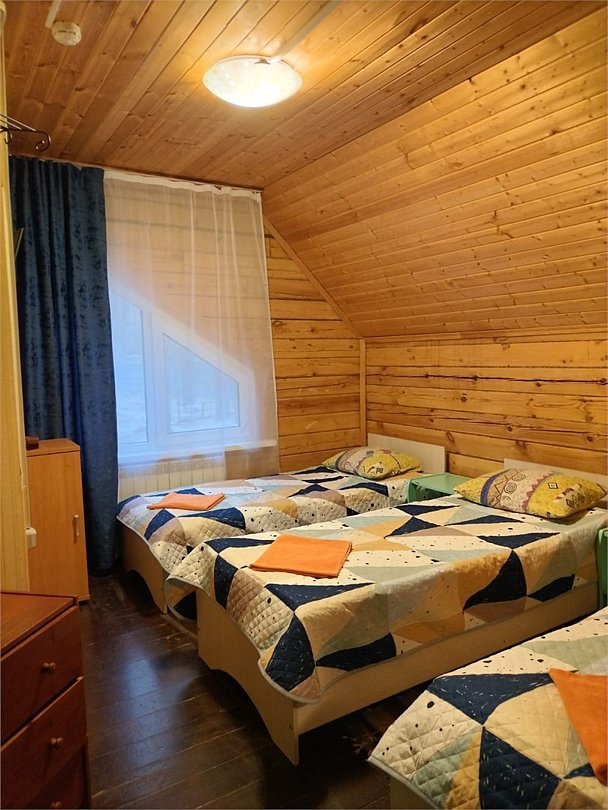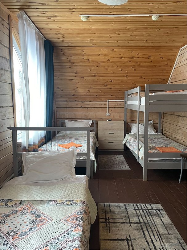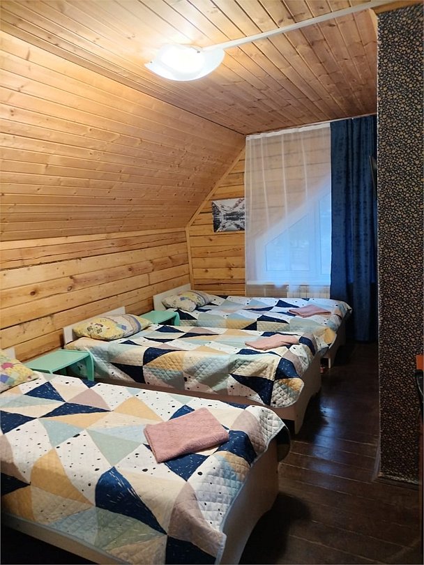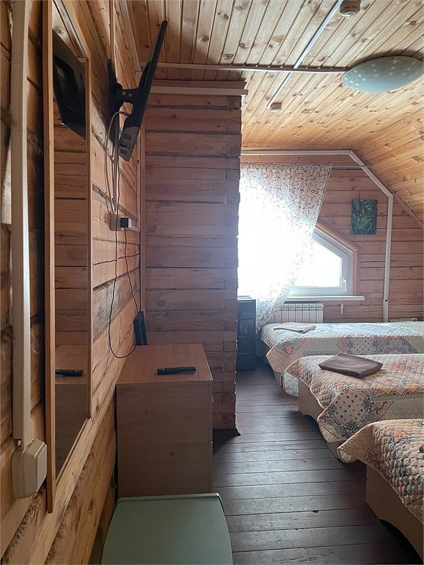 Однокомнатный номер с двумя полутороспальными и одной двухъярусной кроватями расположен на втором этаже деревянного коттеджа, в котором всего 4 номера: один номер на первом этаже и 3 номера на 2 этаже. Номер оборудован зеркалом, комодом, вешалкой для вещей, телевизором с плоским экраном и кабельным ТВ. Ванная комната с душевой кабиной укомплектована банными полотенцами. В коттедже есть общий холл и мини-кухня, оборудованная холодильником, микроволновой печью, электрическим чайником, посудой. По запросу предоставляется: - гладильная доска и утюг, фен для волос; - тапочки и косметические принадлежности можно приобрести за дополнительную оплату. Домашний питомец за дополнительную плату может проживать с вами.Услуги и удобства