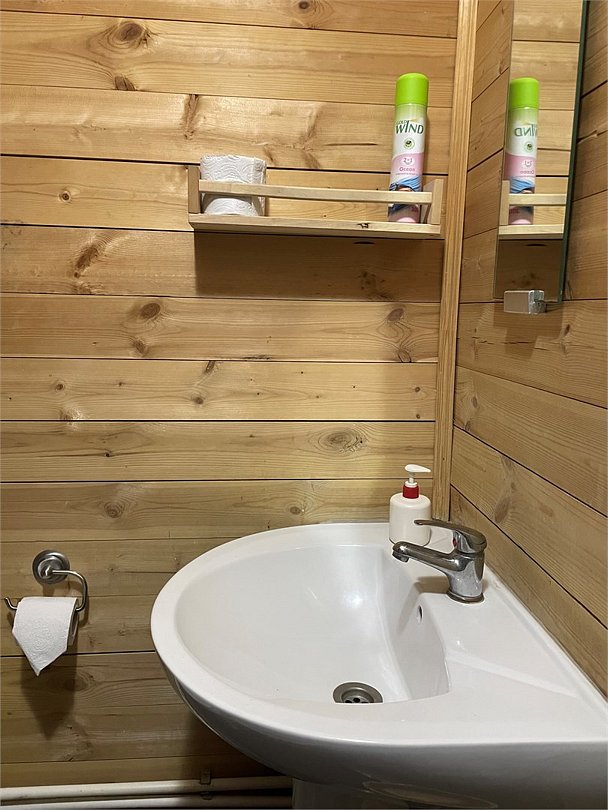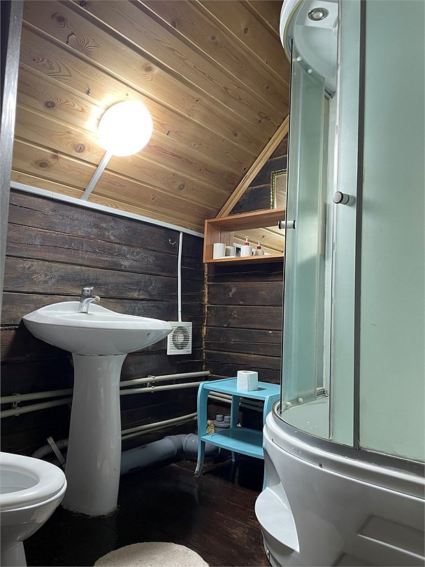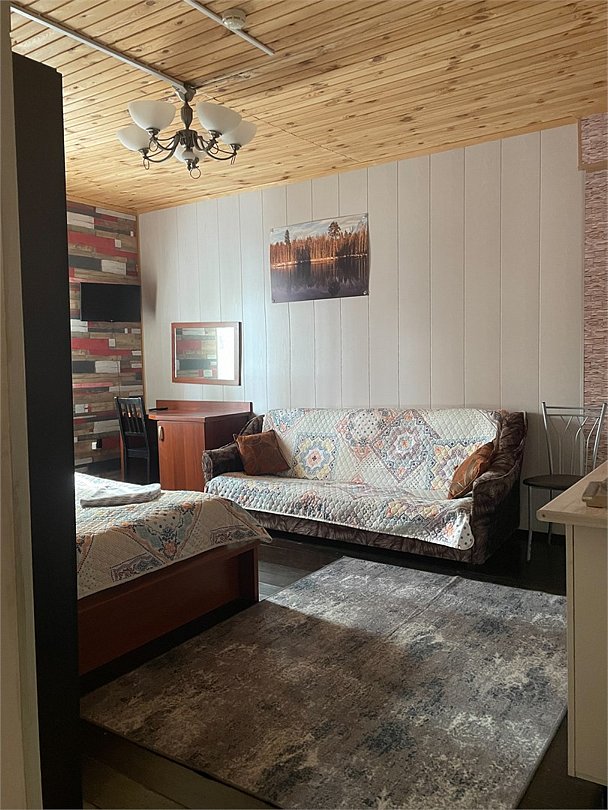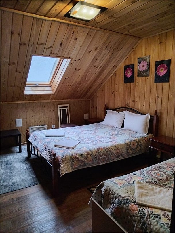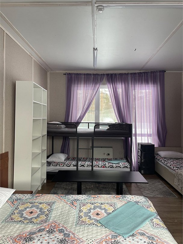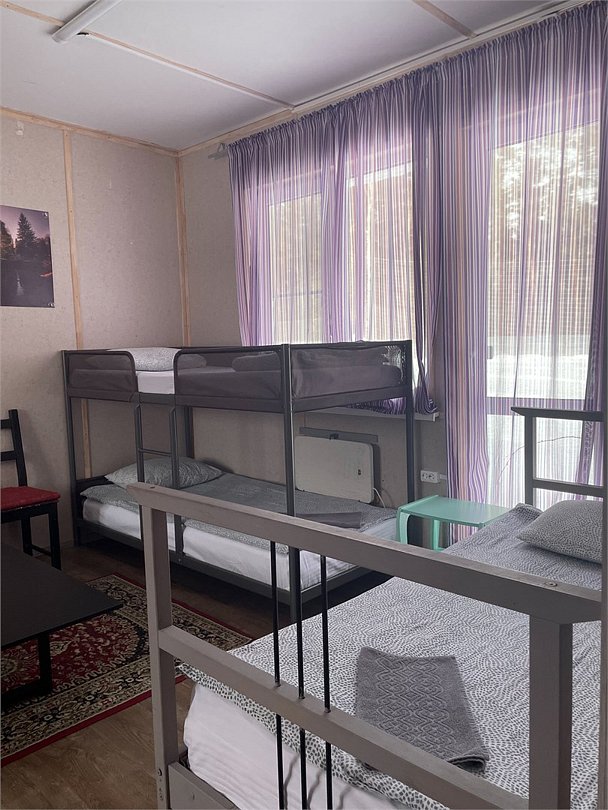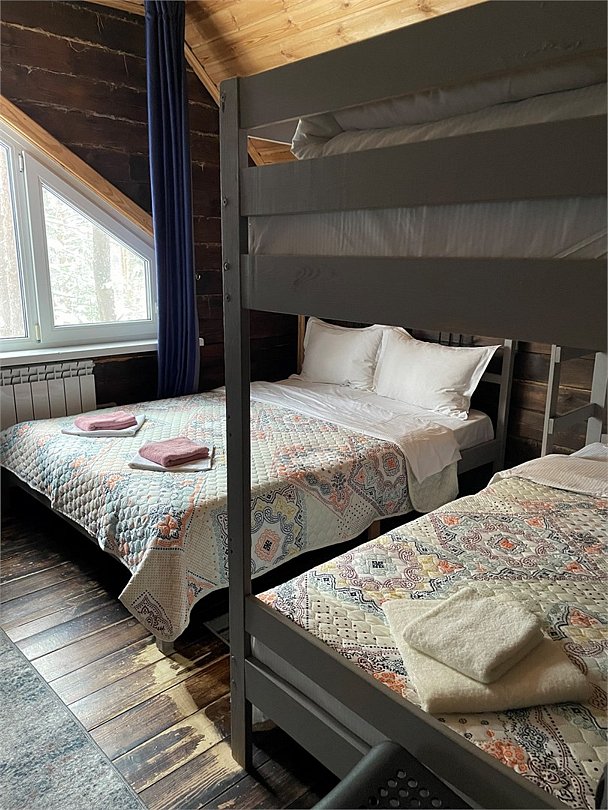 Однокомнатный номер с двумя полутороспальными и одной двухъярусной кроватями расположен на втором этаже деревянного коттеджа, в котором всего 4 номера: один номер на первом этаже и 3 номера на 2 этаже. Номер оборудован зеркалом, комодом, вешалкой для вещей, телевизором с плоским экраном и кабельным ТВ. Ванная комната с душевой кабиной укомплектована банными полотенцами. В коттедже есть общий холл и мини-кухня, оборудованная холодильником, микроволновой печью, электрическим чайником, посудой. По запросу предоставляется: - гладильная доска и утюг, фен для волос; - тапочки и косметические принадлежности можно приобрести за дополнительную оплату. Домашний питомец за дополнительную плату может проживать с вами.Услуги и удобства