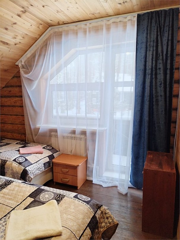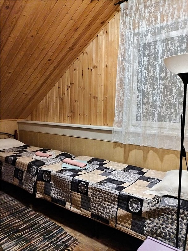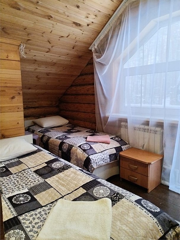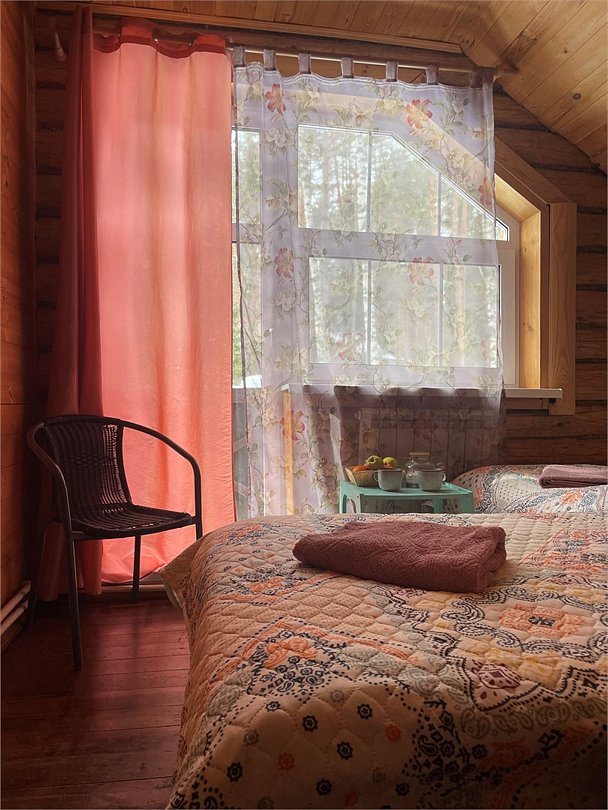 Однокомнатный номер с полутороспальными кроватями расположен на втором этаже деревянного коттеджа, в котором всего 4 номера: один номер на первом этаже и 3 номера на 2 этаже. Номер оборудован зеркалом, комодом, вешалкой для вещей, телевизором с плоским экраном и кабельным ТВ. Ванная комната с душевой кабиной укомплектована банными полотенцами. В коттедже есть общий холл и мини-кухня, оборудованная холодильником, микроволновой печью, электрическим чайником, посудой. По запросу предоставляется: - гладильная доска и утюг, фен для волос; - тапочки и косметические принадлежности можно приобрести за дополнительную оплату. Домашний питомец за дополнительную плату может проживать с вами.Услуги и удобства