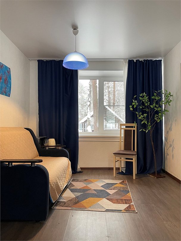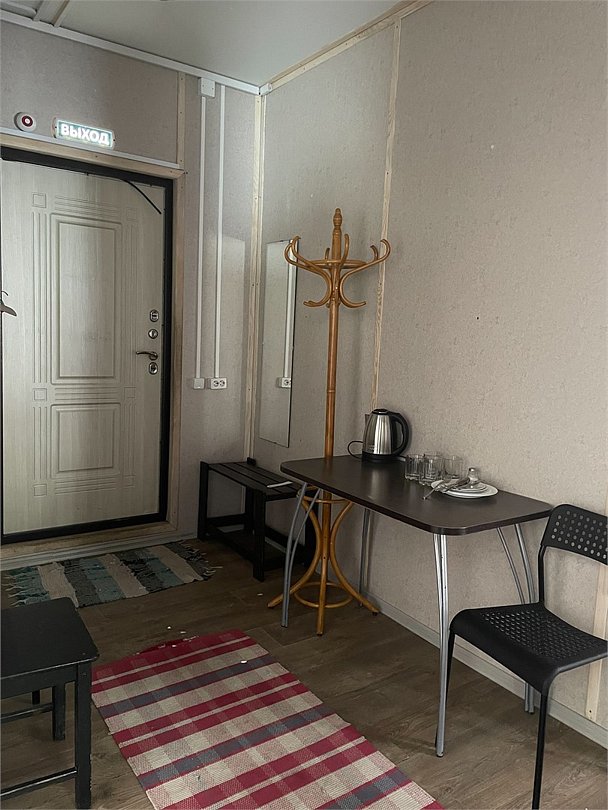 Номер "Аппартаменты" с двумя односпальными кроватями спринг бокс расположен на первом этаже деревянного коттеджа (из бруса), в котором всего 5 номеров: два номера на первом этаже и 3 номера на 2 этаже. Номер оборудован письменным столом, прикроватными тумбами, раскладным диваном, стулом, шкафом для одежды с вешалками, кухонным уголком с необходимой посудой и холодильником, телевизором с плоским экраном и кабельным ТВ. Возможно дополнительно место на диване. Ванная комната с душевой кабиной укомплектована банными полотенцами. Дополнительно гость может приобрести тапочки и косметические средства.Услуги и удобства