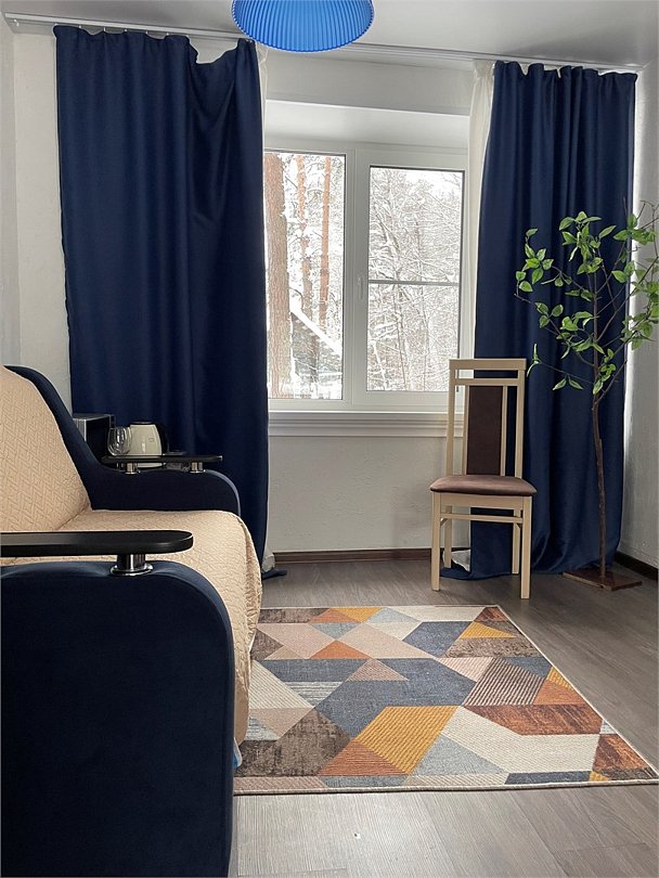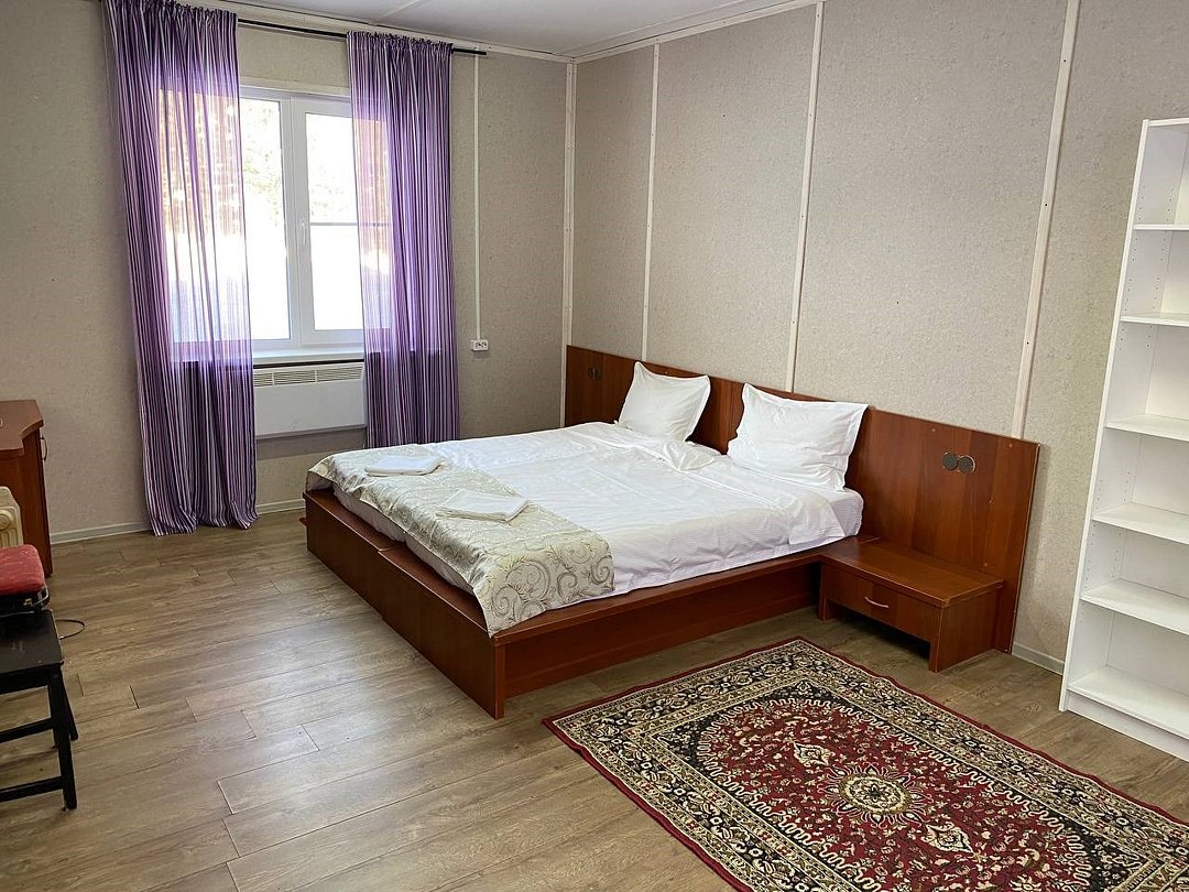 Элегантный эко-номер с отдельным входом, большими окнами, в отдалении от административного здания. Улучшенный элегантный эко-номер с отдельным входом и большими окнами, расположенный в отдалении от административного здания. Номер оборудован журнальным столиком, прикроватными тумбами. Ванная комната с душевой кабиной укомплектована банными полотенцами. По запросу предоставляется: - гладильная доска и утюг, фен для волос; - тапочки и косметические принадлежности можно приобрести за дополнительную оплату. В данном номере не предусмотрено проживание с животными. Если вы планируете приехать к нам со своим питомцем, предлагаем выбрать другую категорию номера для размещения.Услуги и удобства