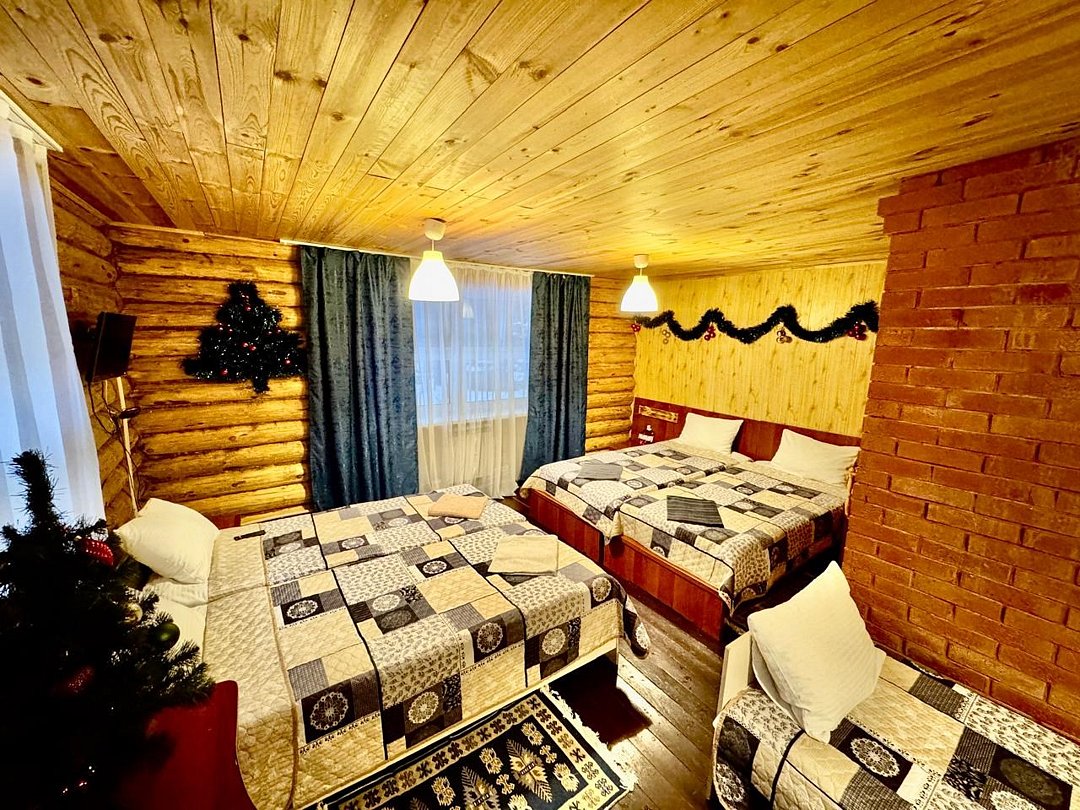 Двухэтажный номер - апартаменты с отдельным входом - в доме из рубленного бруса "Русская изба" И на первом и на втором этаже - санузлы с душевой кабиной. Первый этаж имеет небольшую кухонную зону с холодильником, СВЧ печью, чайником и посудой. Отлично подойдет для отдыха с семьей или друзьями, 6 основных места и 1 дополнительно в двух спальнях на 2 человека и на 4 человека. На втором этаже – две спальни с балконом. Одна комната с 4 кроватями- бокс спрингами и раскладным диваном. Вторая - с двумя односпальными кроватями. По запросу предоставляется: - гладильная доска и утюг, фен для волос; - тапочки и косметические принадлежности можно приобрести за дополнительную оплату. Домашний питомец за дополнительную плату может проживать с вами.Услуги и удобства