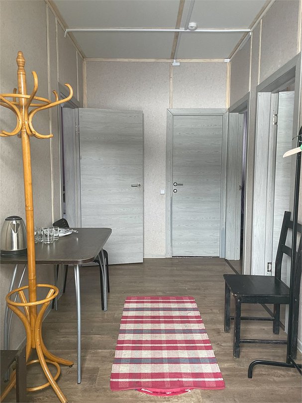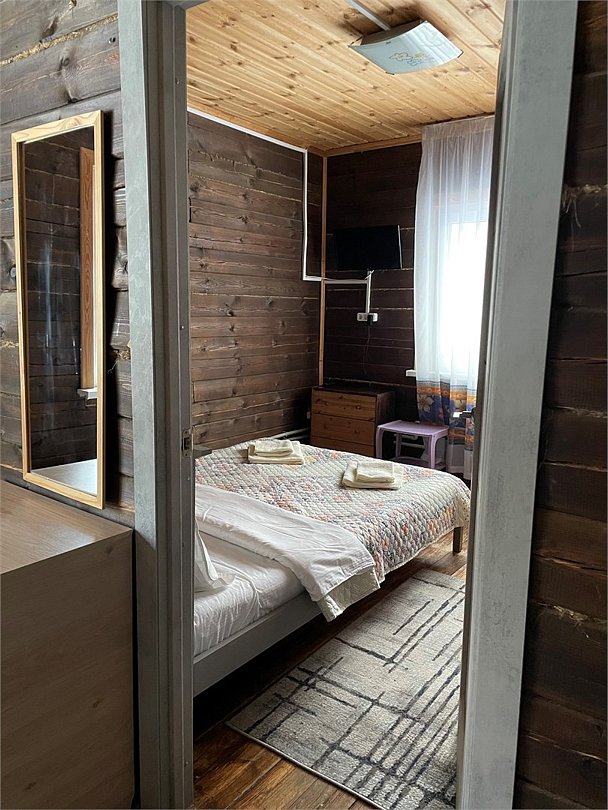 Двухкомнатный номер расположен на первом этаже деревянного коттеджа, в котором всего 4 номера: один номер на первом этаже и 3 номера на 2 этаже. В одной комнате полутороспальная кровать, в другой комнате 3 полутороспальных кровати (спрингбокс). Номер оборудован зеркалом, комодом, вешалкой для вещей, телевизором с плоским экраном и кабельным ТВ. Ванная комната с душевой кабиной укомплектована банными полотенцами. В коттедже есть общий холл и мини-кухня, оборудованная холодильником, микроволновой печью, электрическим чайником, посудой. Дополнительно гость может приобрести тапочки и косметические средства.Услуги и удобства