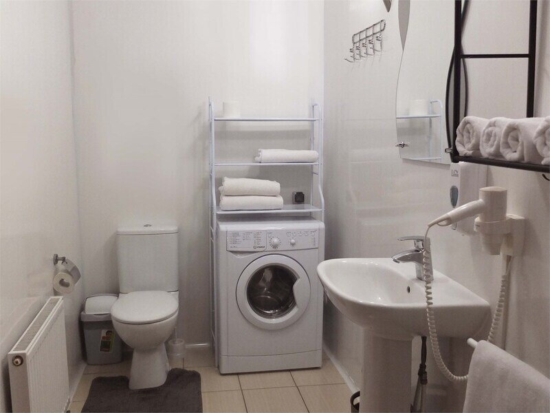 Оборудованная кухня: холодильник, варочная поверхность, посудомоечная машина, стиральная машина, микроволновая печь, электрический чайник, комплект посуды на каждого гостя, столовые приборы, комплект посуды для приготовления.