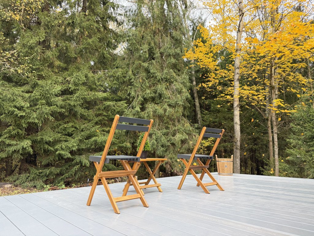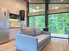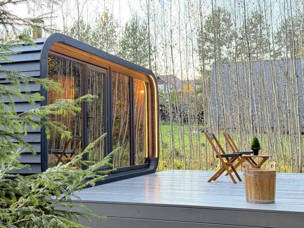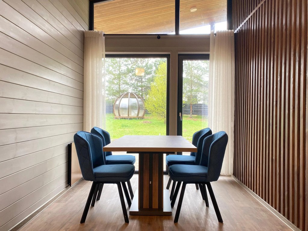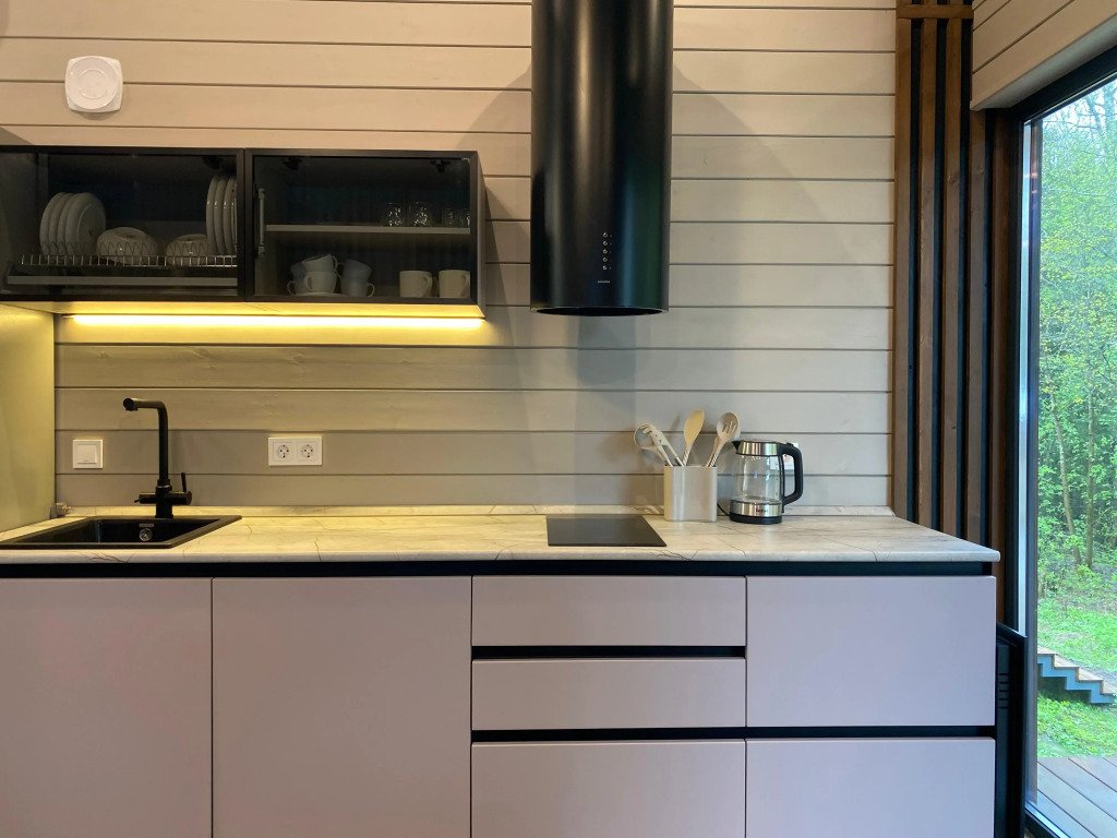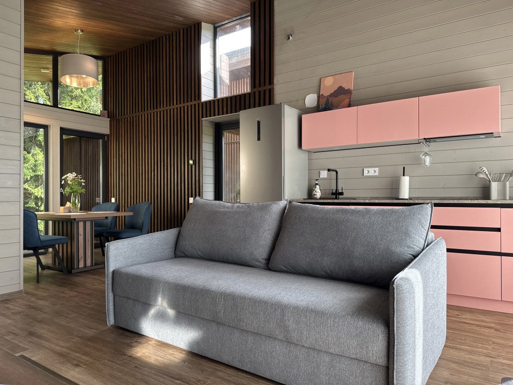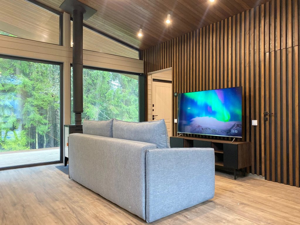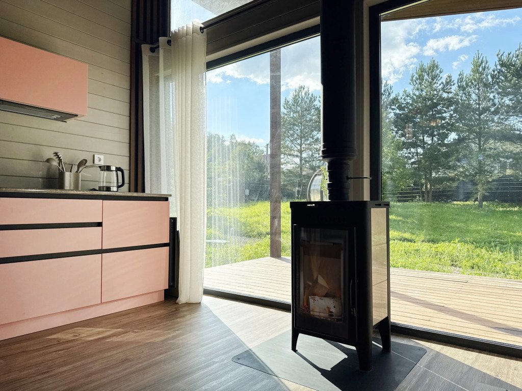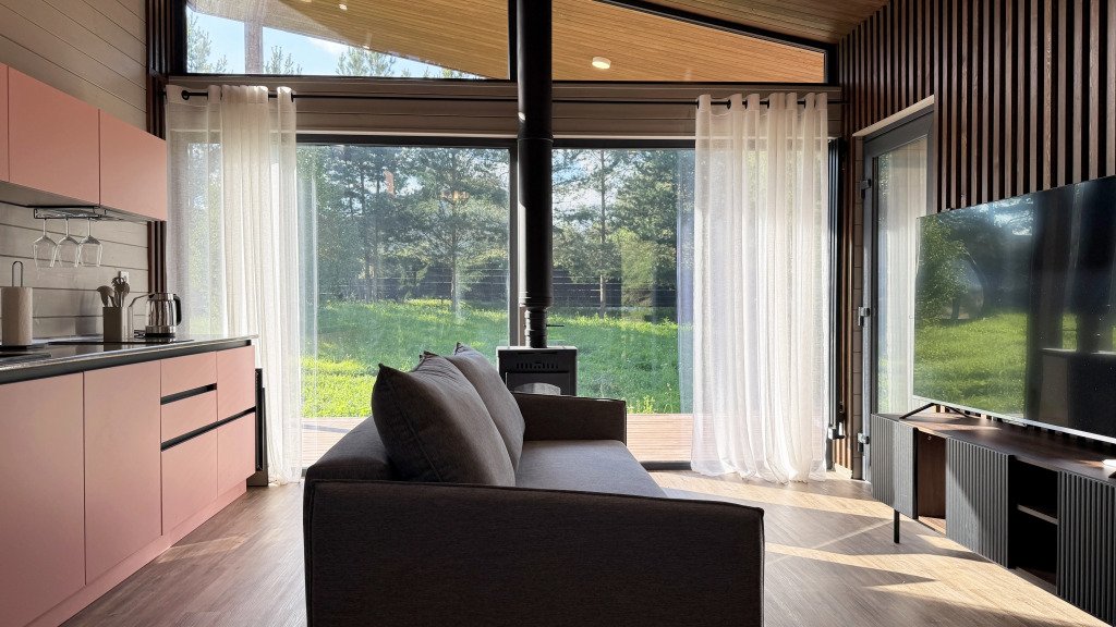 В каждой половине дома: спальня со спальным местом 160 см × 200 см, кухня-гостиная с раскладным диван 140 см × 200 см, техника: Wi-Fi, Смарт ТВ, плита, холодильник, микроволновая печь, посудомоечная машина, стиральная машина, электрический чайник, дровяная печь, фен, вентилятор, игровая приставка Xbox.