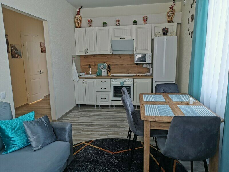 - Вся необходимая для приготовления и приема пищи посуда, бокалы, стопки, холодильник, плита, духовка, микроволновка, чайник,
