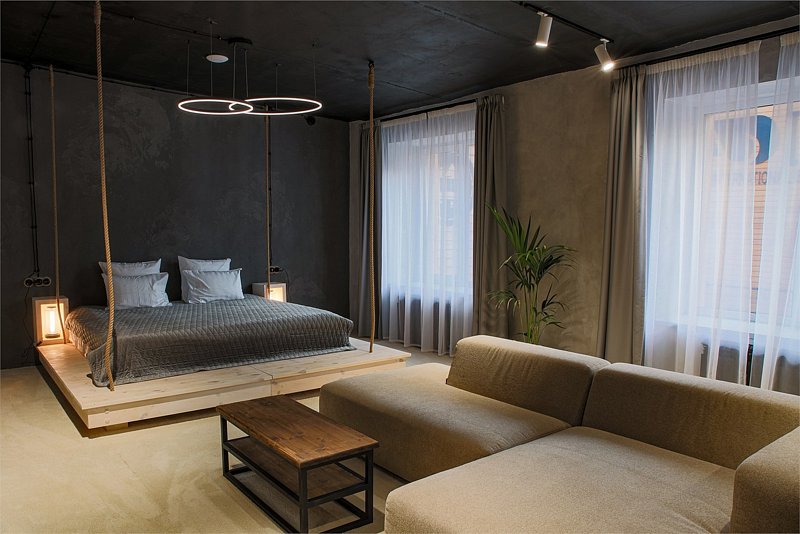 Современный, просторный номер с дизайнерскими решениями, визуально разделен на гостиную и спальню.