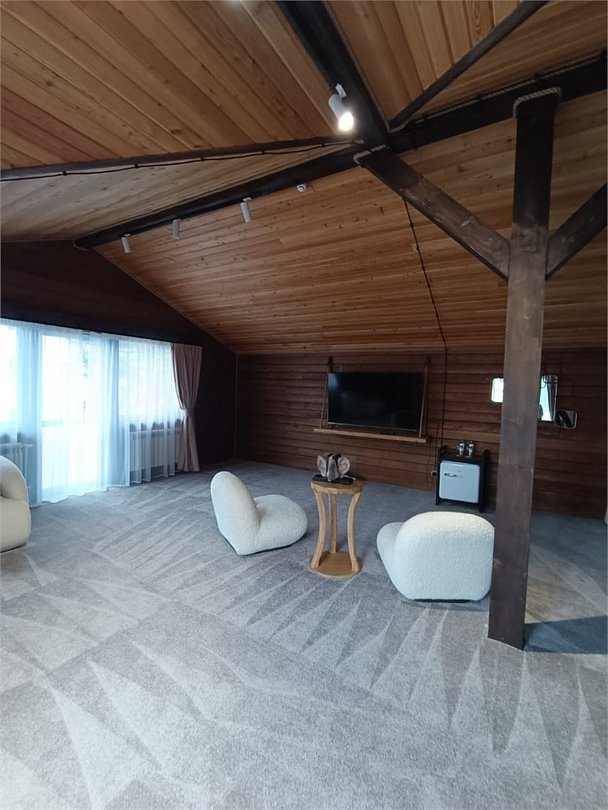 В номере большая кровать 200*200 на 2 этаже. На 1 этаже располагается уютная гостиная с зоной отдыха: 2 кресла и журнальный столик, телевизор. Обеденная зона укомплектована: Кофе-машиной, чайник, чайный набор: чай, кофе, сахар, раковина, микроволновка, холодильник.